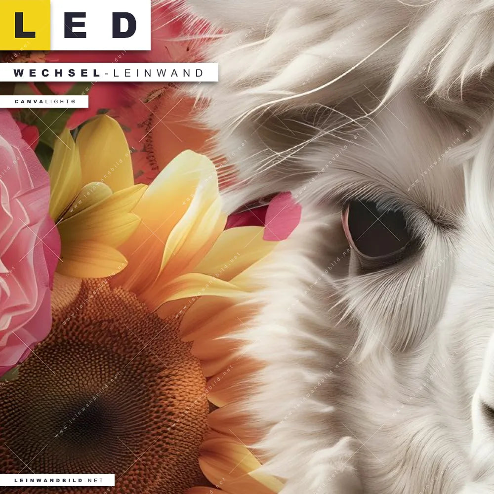 Dann sollte die Wechsel-Leinwand Canvalight® TEX | Alpaka mit Blumen | Panorama den Weg zu Dir finden. Die Austausch-Leinwand Lama Kunstwerk mit Blumen - passend für unsere stufenlos dimmbaren, steckerfertigen Leinwandbilder im LED Leuchtrahmen mit Fernbedienung und optionaler Farbtemperatursteuerung - fügt sich als Eye-Catcher harmonisch in jedes Wohnzimmer - Schlafzimmer, Kinderzimmer, Flur - Eingangsbereich Raumkonzept ein.