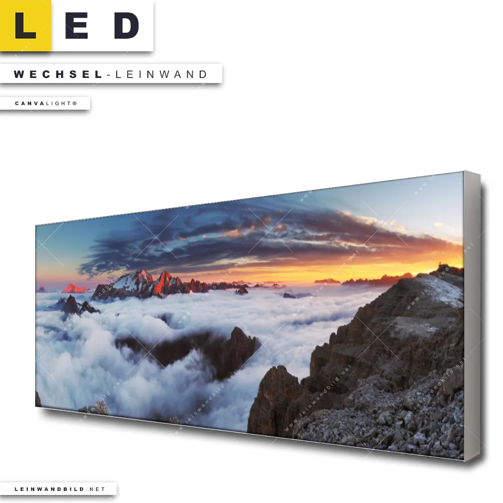 Du bist auf der Suche nach einer Landschaften Wechsel-Leinwand für Dein LED-Leinwandbild im Panorama-Format? Begriffe wie Landschaft, Natur, Stille, Berge, Sonnenuntergang, Sonnenaufgang, Sonne, Gebirge, Nebel, Steine haben Dich auf der Suche nach Deiner Ersatz-Leinwand für dein extra breites LED Wandbild mit wechselbarer Leinwand inspiriert? Farben wie Orange, Blau, Rot, Weiss, Braun, Bunt, Hellblau dürfen auf Deinem neuen Wechselmotiv für Dein XXL Leinwand-LED-Bild nicht fehlen und Leinwände im Natürlich - Realistisch, Mixed Media Stil für Leuchtbilder passen perfekt zu Deinem Einrichtungsstil?
