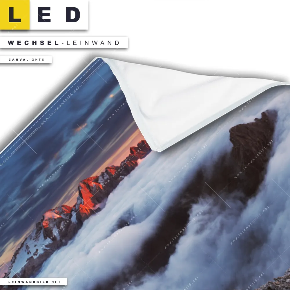 Dann sollte die Wechsel-Leinwand Canvalight® TEX | Alpen im Nebel | Quadrat den Weg zu Dir finden. Die Austausch-Leinwand Bergspitzen - passend für unsere stufenlos dimmbaren, steckerfertigen Leinwandbilder im Leuchtrahmen mit Fernbedienung und optionaler Farbtemperatursteuerung - fügt sich als Eye-Catcher harmonisch in jedes Arzt - Praxis, Büro - Kanzlei, Wohnzimmer - Schlafzimmer Raumkonzept ein.