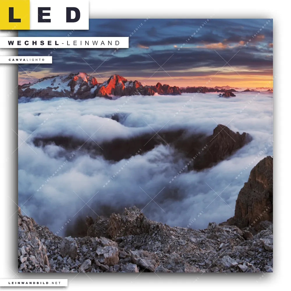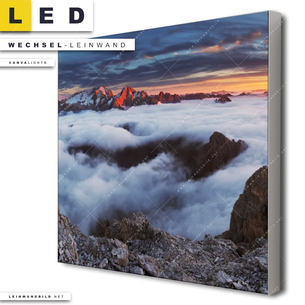 Du bist auf der Suche nach einer Landschaften Wechsel-Leinwand für Dein LED-Leinwandbild im Quadratischen Format? Begriffe wie Landschaft, Natur, Stille, Berge, Sonnenuntergang, Sonnenaufgang, Sonne, Gebirge, Nebel, Steine haben Dich auf der Suche nach Deiner Ersatz-Leinwand für dein LED Wandbild mit wechselbarer Leinwand inspiriert? Farben wie Orange, Blau, Rot, Weiss, Braun, Bunt, Hellblau dürfen auf Deinem neuen Wechselmotiv für Dein XXL Leinwand-LED-Bild nicht fehlen und Leinwände im Natürlich - Realistisch, Mixed Media Stil für Leuchtbilder passen perfekt zu Deinem Einrichtungsstil?