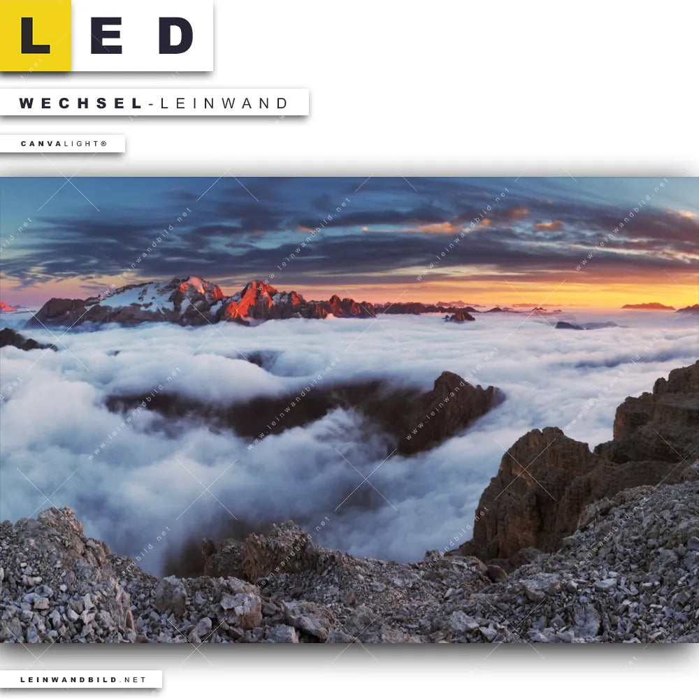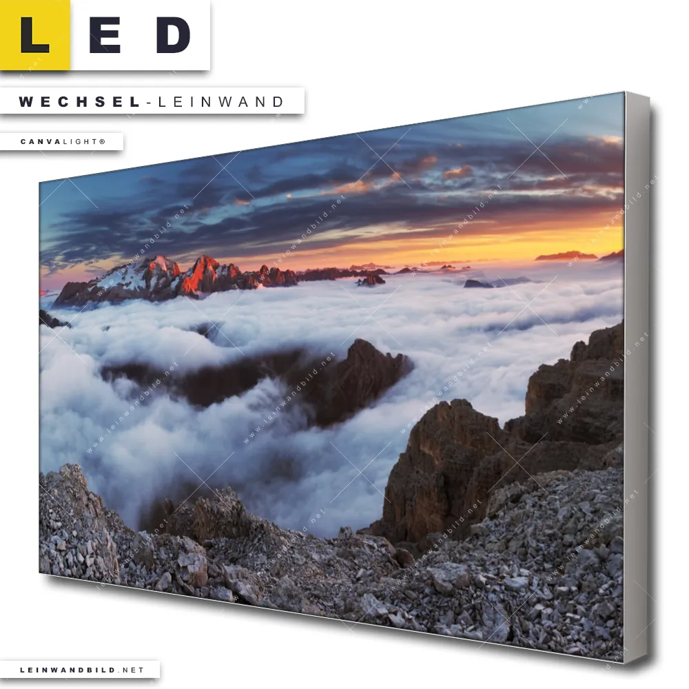 Du bist auf der Suche nach einer Landschaften Wechsel-Leinwand für Dein LED-Leinwandbild im Querformat? Begriffe wie Landschaft, Natur, Stille, Berge, Sonnenuntergang, Sonnenaufgang, Sonne, Gebirge, Nebel, Steine haben Dich auf der Suche nach Deiner Ersatz-Leinwand für dein breites LED Wandbild mit wechselbarer Leinwand inspiriert? Farben wie Orange, Blau, Rot, Weiss, Braun, Bunt, Hellblau dürfen auf Deinem neuen Wechselmotiv für Dein XXL Leinwand-LED-Bild nicht fehlen und Leinwände im Natürlich - Realistisch, Mixed Media Stil für Leuchtbilder passen perfekt zu Deinem Einrichtungsstil?
