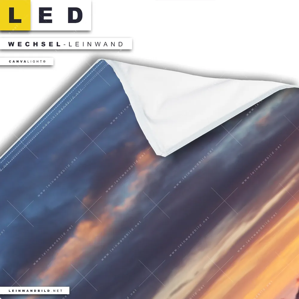 Bitte beachte, dass die Farben, der auf dem Monitor abgebildeten Sonnenuntergang über den Wolken Darstellung, möglicherweise von den Originalfarben deiner Canvalight® TEX Wechsel-Leinwand abweichen können.