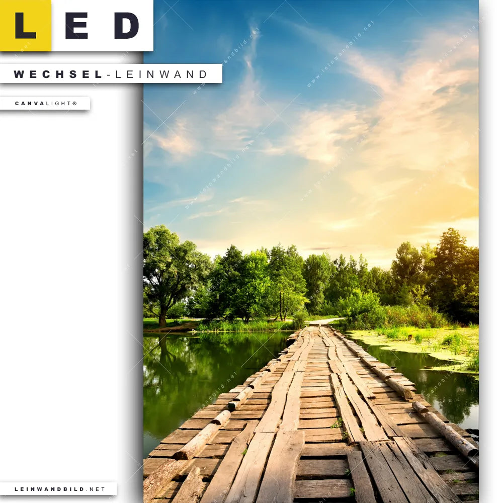 Bitte beachte, dass die Farben, der auf dem Monitor abgebildeten Holzbrücke über fließendem Gewässer Darstellung, möglicherweise von den Originalfarben deiner Canvalight® TEX Wechsel-Leinwand abweichen können.