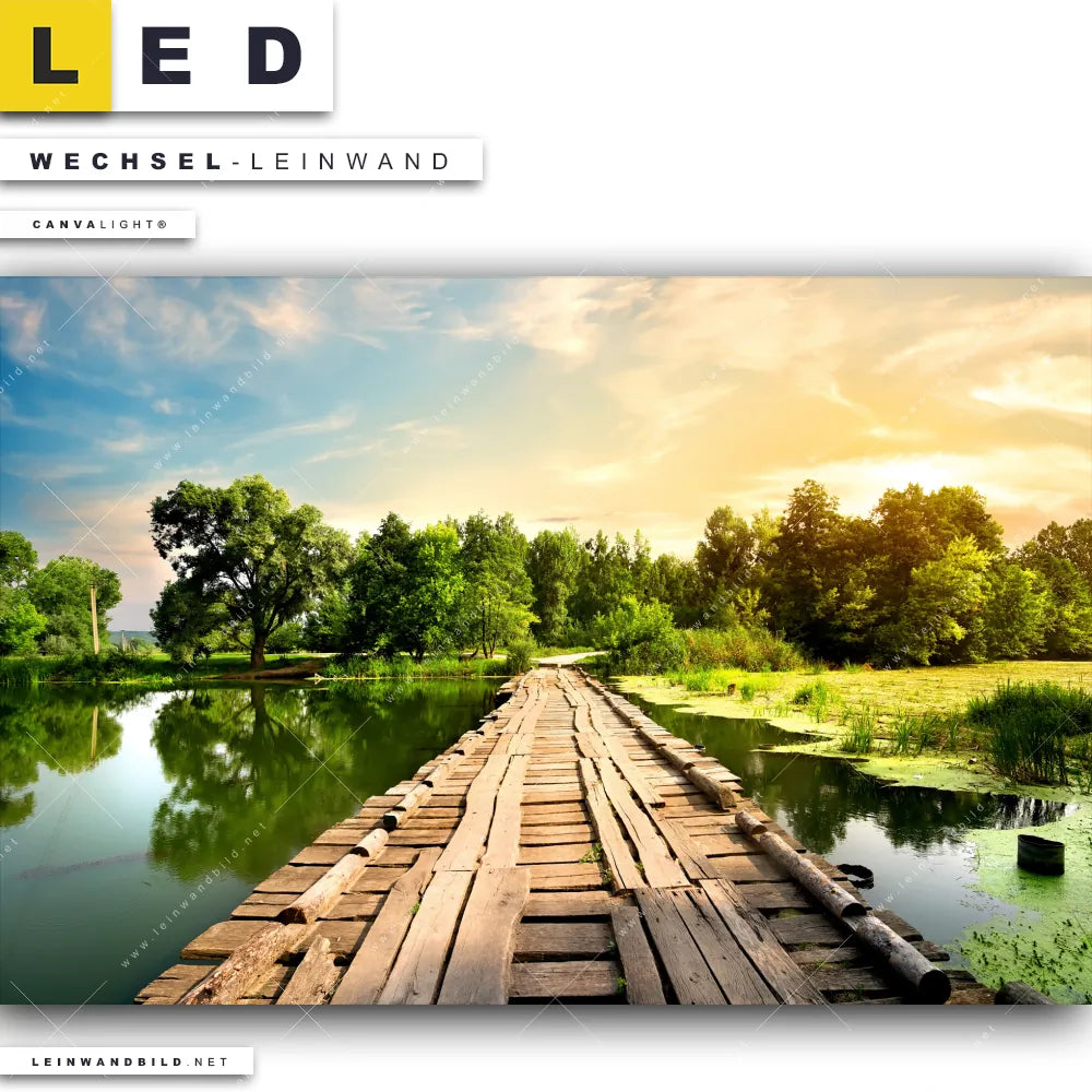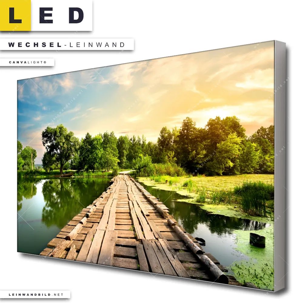 Dann sollte die Wechsel-Leinwand Canvalight® TEX | Alte Brücke am Fluss | Querformat den Weg zu Dir finden. Die Austausch-Leinwand Holzsteg am Wasser - passend für unsere stufenlos dimmbaren, steckerfertigen Leinwandbilder im Leuchtrahmen mit Fernbedienung und optionaler Farbtemperatursteuerung - fügt sich als Eye-Catcher harmonisch in jedes Arzt - Praxis, Wohnzimmer - Schlafzimmer, Küche - Esszimmer, Flur - Eingangsbereich, Büro - Kanzlei Raumkonzept ein.