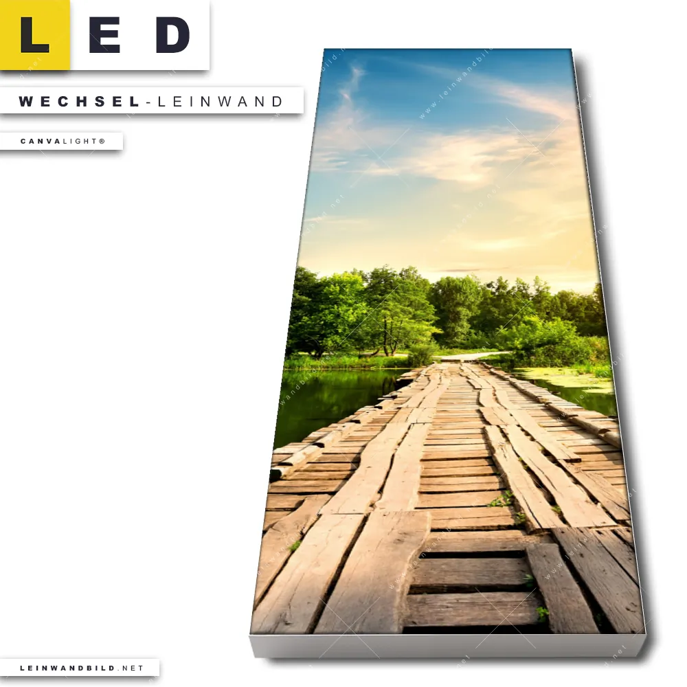 Dann sollte die Wechsel-Leinwand Canvalight® TEX | Alte Brücke am Fluss | Schmal den Weg zu Dir finden. Die Austausch-Leinwand Hölzener Steg am Fluss - passend für unsere stufenlos dimmbaren, steckerfertigen Leinwandbilder im LED Leuchtrahmen mit Fernbedienung und optionaler Farbtemperatursteuerung - fügt sich als Eye-Catcher harmonisch in jedes Arzt - Praxis, Wohnzimmer - Schlafzimmer, Küche - Esszimmer, Flur - Eingangsbereich, Büro - Kanzlei Raumkonzept ein.