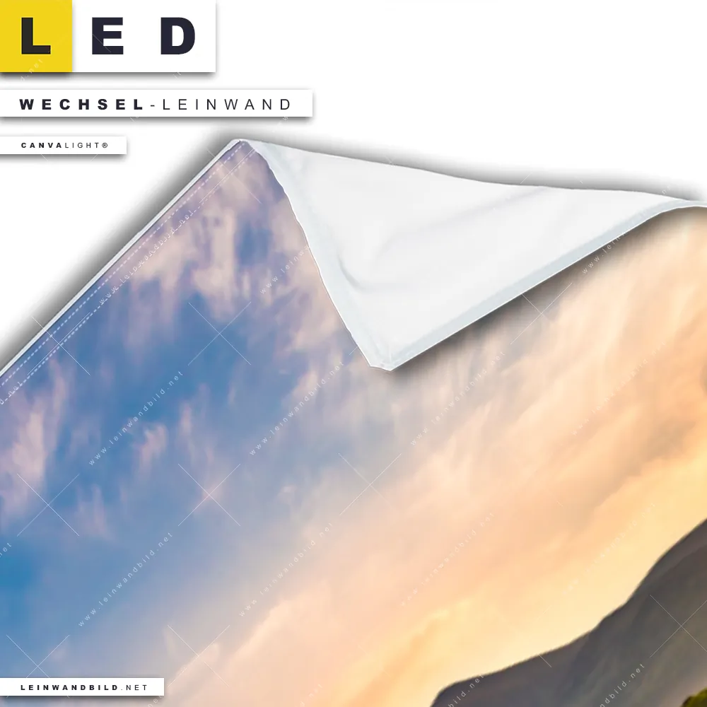 Bitte beachte, dass die Farben, der auf dem Monitor abgebildeten Burgblick bei Sonnenuntergang Darstellung, möglicherweise von den Originalfarben deiner Canvalight® TEX Wechsel-Leinwand abweichen können.
