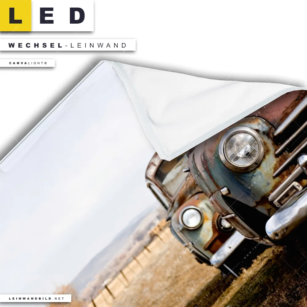 Du konfigurierst Deine individuelle LED Wechsel-Leinwand Canvalight® TEX | Alte rostige Autos | Querformat und wir produzieren sie NEU für Dich. Unsere Fahrzeuge Austausch-Fotoleinwände für Canvalight® LED Bilder sind KEINE Lagerware. Du bist Dir unsicher, welches Motiv oder Format das richtige für dein individuelles LED Wechselmotiv auf Leinwand ist, dann helfen wir dir gerne weiter und beraten dich!