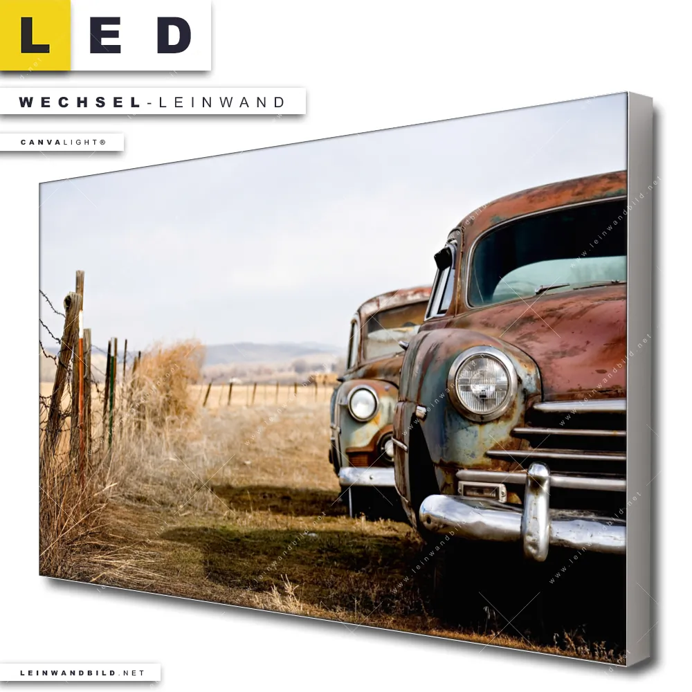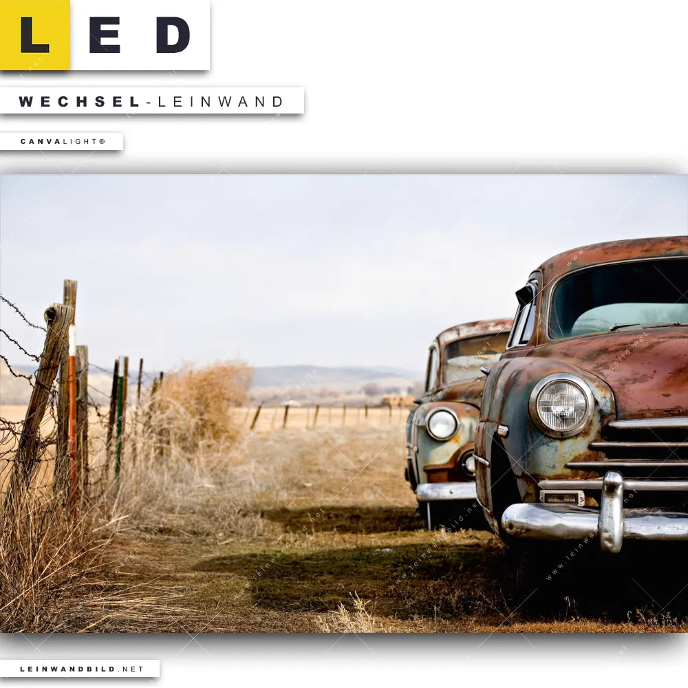 LED Wechsel-Leinwand Canvalight® TEX | Alte rostige Autos | Querformat