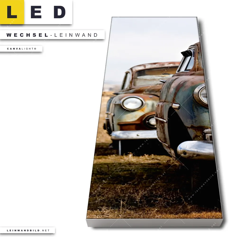 Du konfigurierst Deine individuelle LED Wechsel-Leinwand Canvalight® TEX | Alte rostige Autos | Schmal und wir produzieren sie NEU für Dich. Unsere Fahrzeuge Austausch-Fotoleinwände für Canvalight® LED Bilder sind KEINE Lagerware. Du bist Dir unsicher, welches Motiv oder Format das richtige für dein individuelles LED Wechselmotiv auf Leinwand ist, dann helfen wir dir gerne weiter und beraten dich!