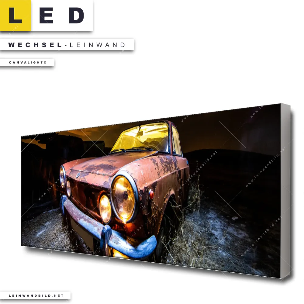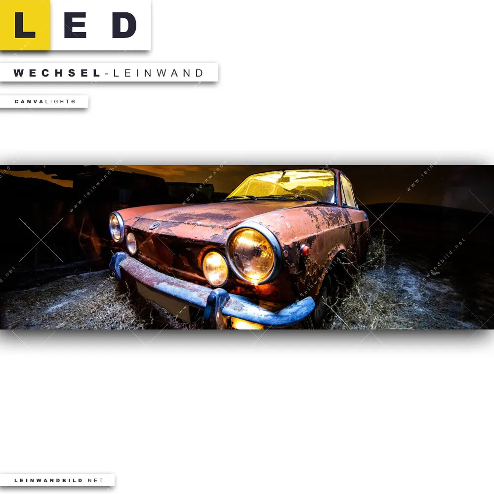 Dann sollte die Wechsel-Leinwand Canvalight® TEX | Altes Auto | Panorama den Weg zu Dir finden. Die Austausch-Leinwand Oldtimer rostrot - passend für unsere stufenlos dimmbaren, steckerfertigen Leinwandbilder im LED Leuchtrahmen mit Fernbedienung und optionaler Farbtemperatursteuerung - fügt sich als Eye-Catcher harmonisch in jedes Bar - Gastronomie, Büro - Kanzlei, Flur - Eingangsbereich, Wohnzimmer - Schlafzimmer Raumkonzept ein.