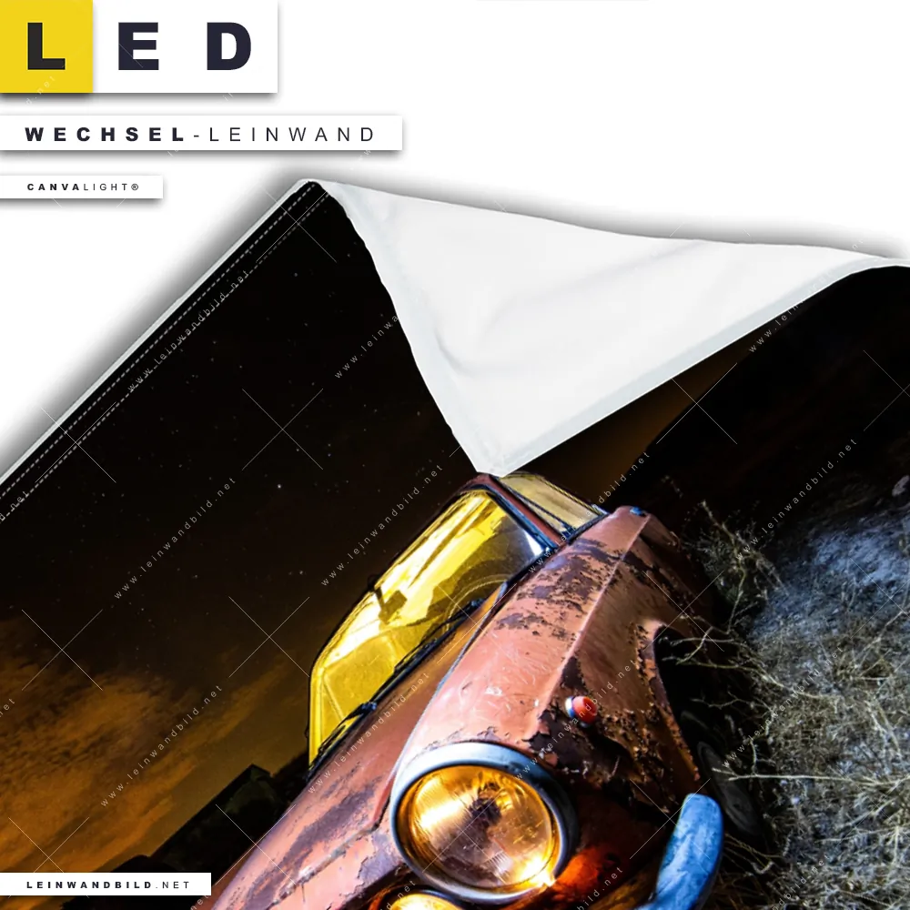 Bitte beachte, dass die Farben, der auf dem Monitor abgebildeten rostiges Auto mit Lichteffekten Darstellung, möglicherweise von den Originalfarben deiner Canvalight® TEX Wechsel-Leinwand abweichen können.