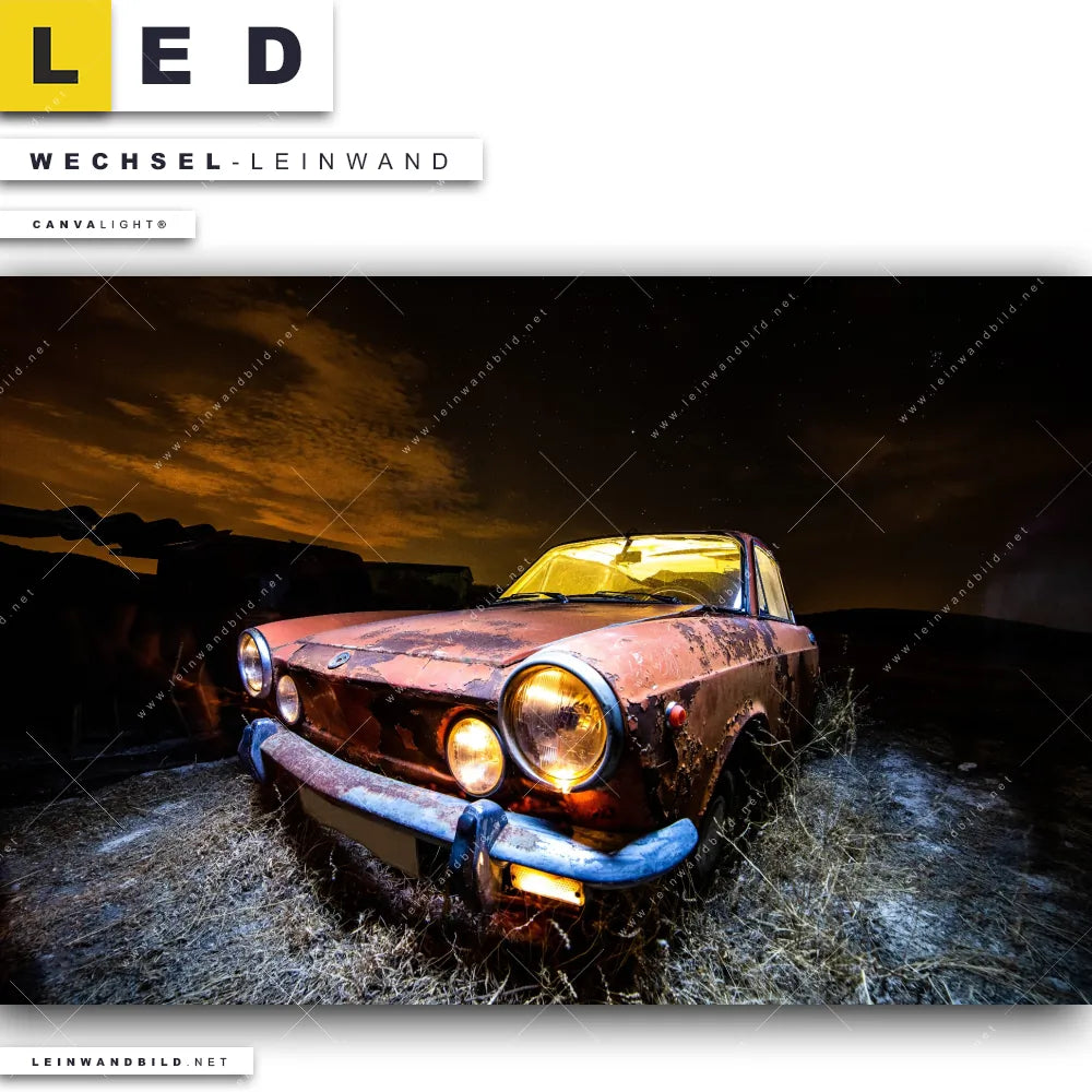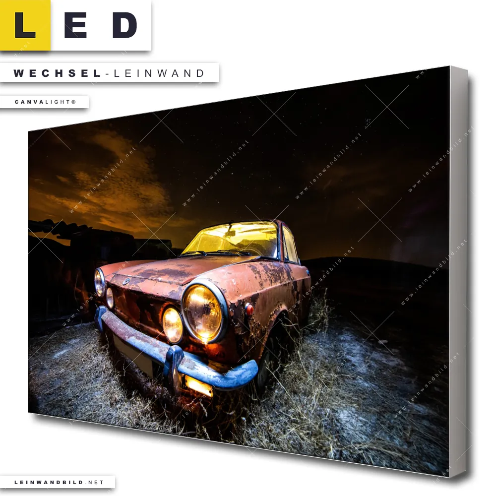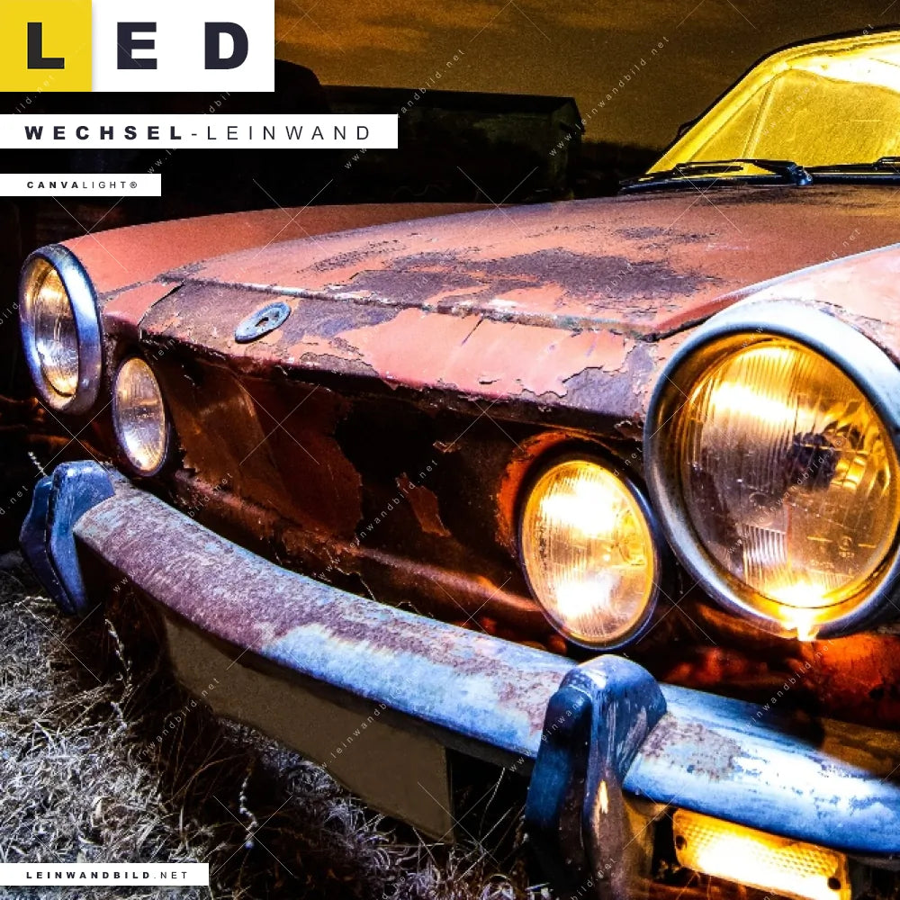 Dann sollte die Wechsel-Leinwand Canvalight® TEX | Altes Auto | Querformat den Weg zu Dir finden. Die Austausch-Leinwand altes Auto mit Rost und Licht - passend für unsere stufenlos dimmbaren, steckerfertigen Leinwandbilder im Leuchtrahmen mit Fernbedienung und optionaler Farbtemperatursteuerung - fügt sich als Eye-Catcher harmonisch in jedes Bar - Gastronomie, Büro - Kanzlei, Flur - Eingangsbereich, Wohnzimmer - Schlafzimmer Raumkonzept ein.