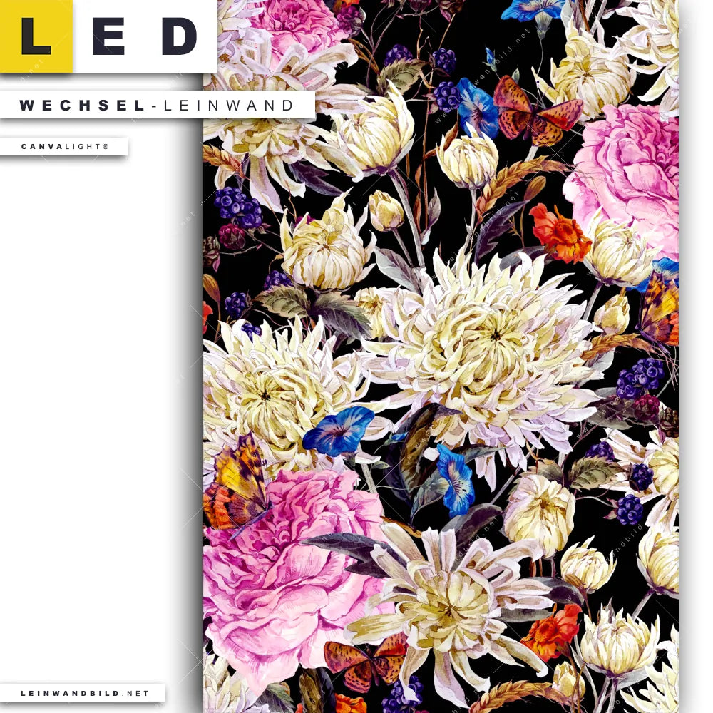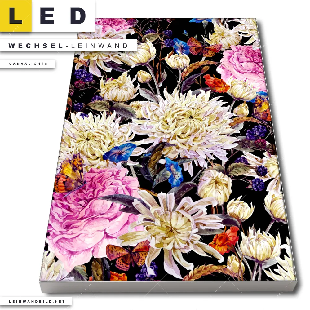Du bist auf der Suche nach einer Blumen - Botanik Wechsel-Leinwand für Dein LED-Leinwandbild im Hochformat? Begriffe wie Blume, Botanik, Pflanze, Natur, Aquarell, Wasserfarbe, Blumen, romantisch, Blüten, Bouquet, Blumenstrauß, Schmetterling haben Dich auf der Suche nach Deiner Ersatz-Leinwand für dein LED Wandbild mit wechselbarer Leinwand inspiriert? Farben wie Weiss, Schwarz, Blau, Lila, Orange, Rot, Rosa dürfen auf Deinem neuen Wechselmotiv für Dein XXL Leinwand-LED-Bild nicht fehlen und Leinwände im Floral, Retro - Vintage Stil für Leuchtbilder passen perfekt zu Deinem Einrichtungsstil?