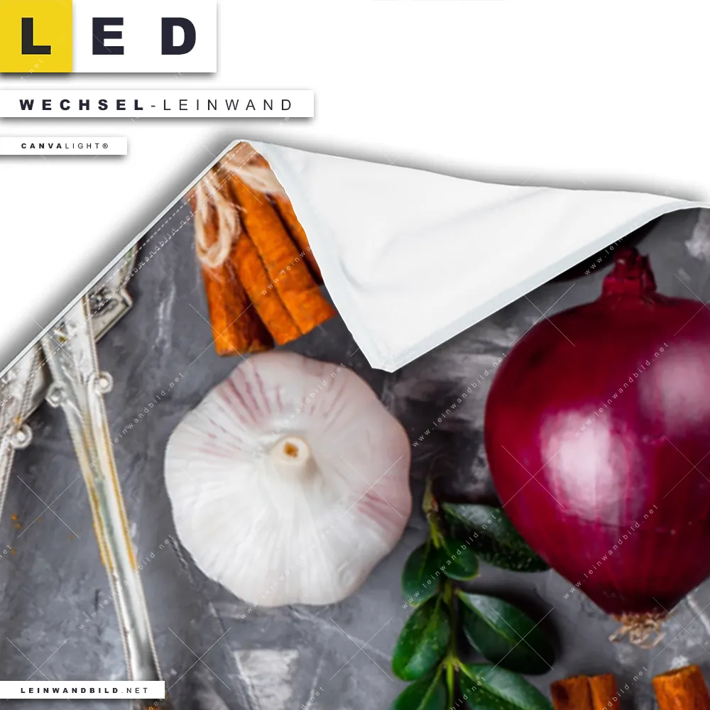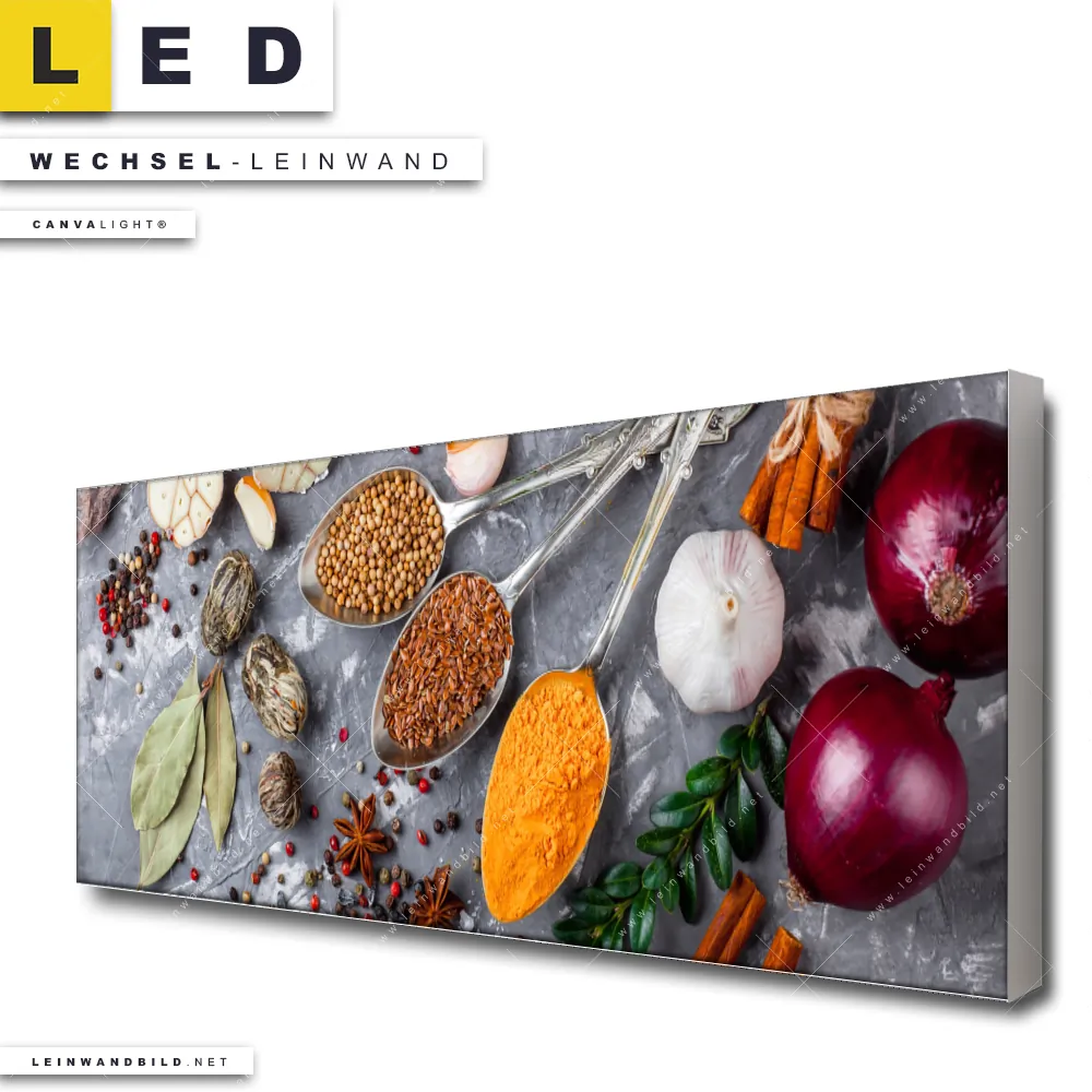Du konfigurierst Deine individuelle LED Wechsel-Leinwand Canvalight® TEX | Aromatische Gewürze | Panorama und wir produzieren sie NEU für Dich. Unsere Essen - Trinken Austausch-Fotoleinwände für Canvalight® LED Bilder sind KEINE Lagerware. Du bist Dir unsicher, welches Motiv oder Format das richtige für dein individuelles LED Wechselmotiv auf Leinwand ist, dann helfen wir dir gerne weiter und beraten dich!