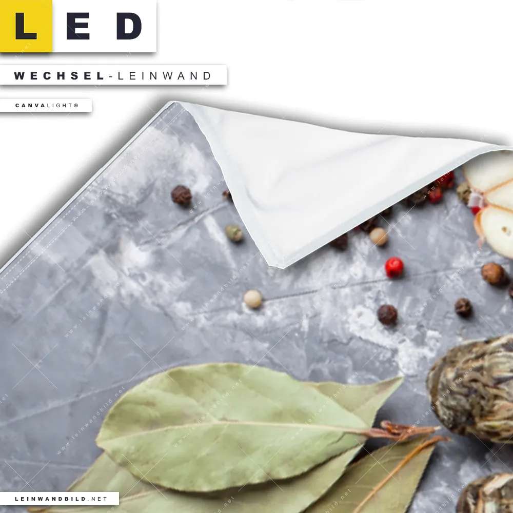 Du konfigurierst Deine individuelle LED Wechsel-Leinwand Canvalight® TEX | Aromatische Gewürze | Schmal und wir produzieren sie NEU für Dich. Unsere Essen - Trinken Austausch-Fotoleinwände für Canvalight® LED Bilder sind KEINE Lagerware. Du bist Dir unsicher, welches Motiv oder Format das richtige für dein individuelles LED Wechselmotiv auf Leinwand ist, dann helfen wir dir gerne weiter und beraten dich!
