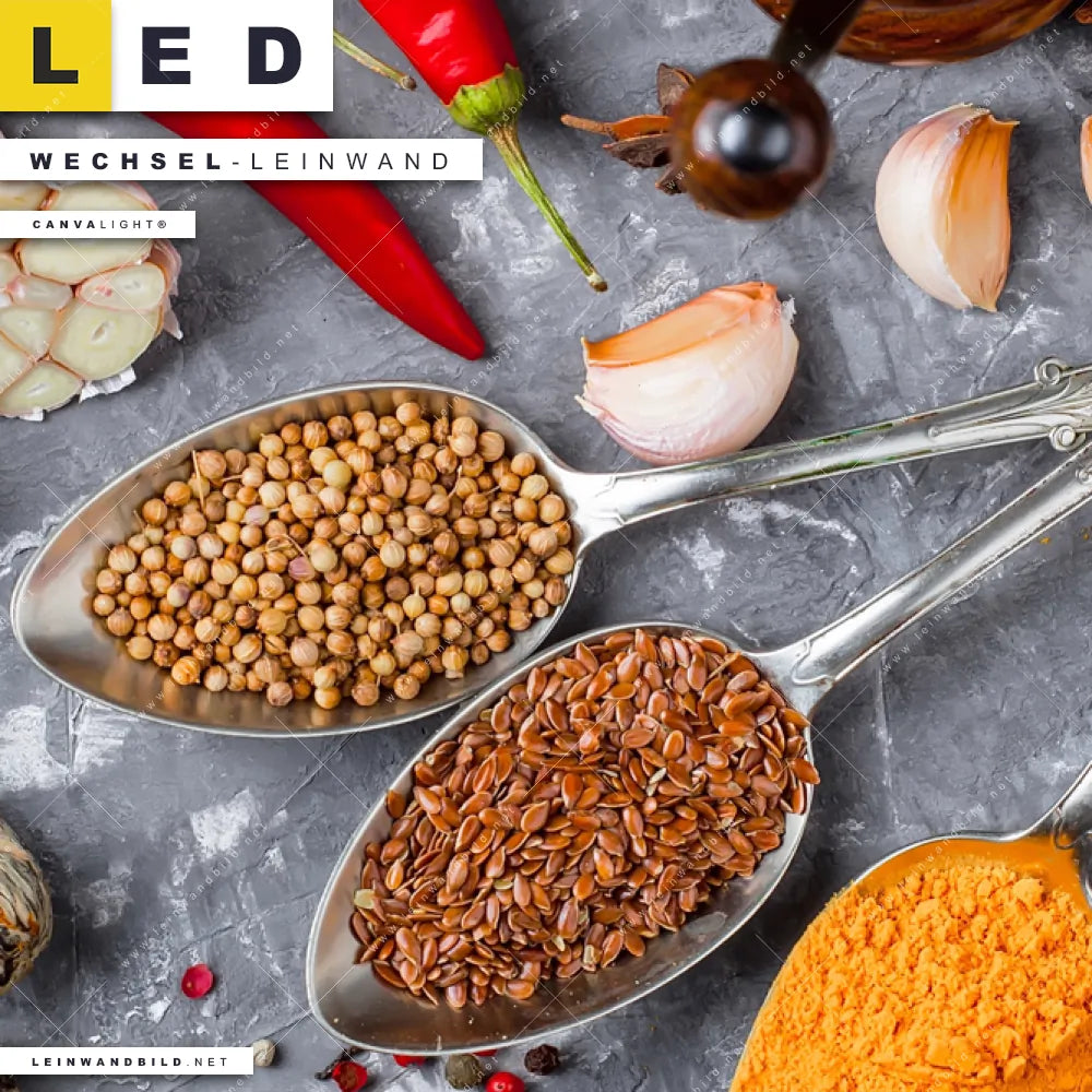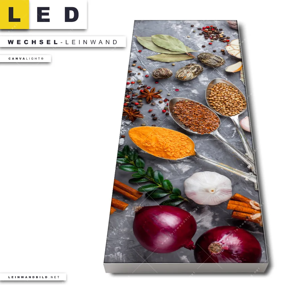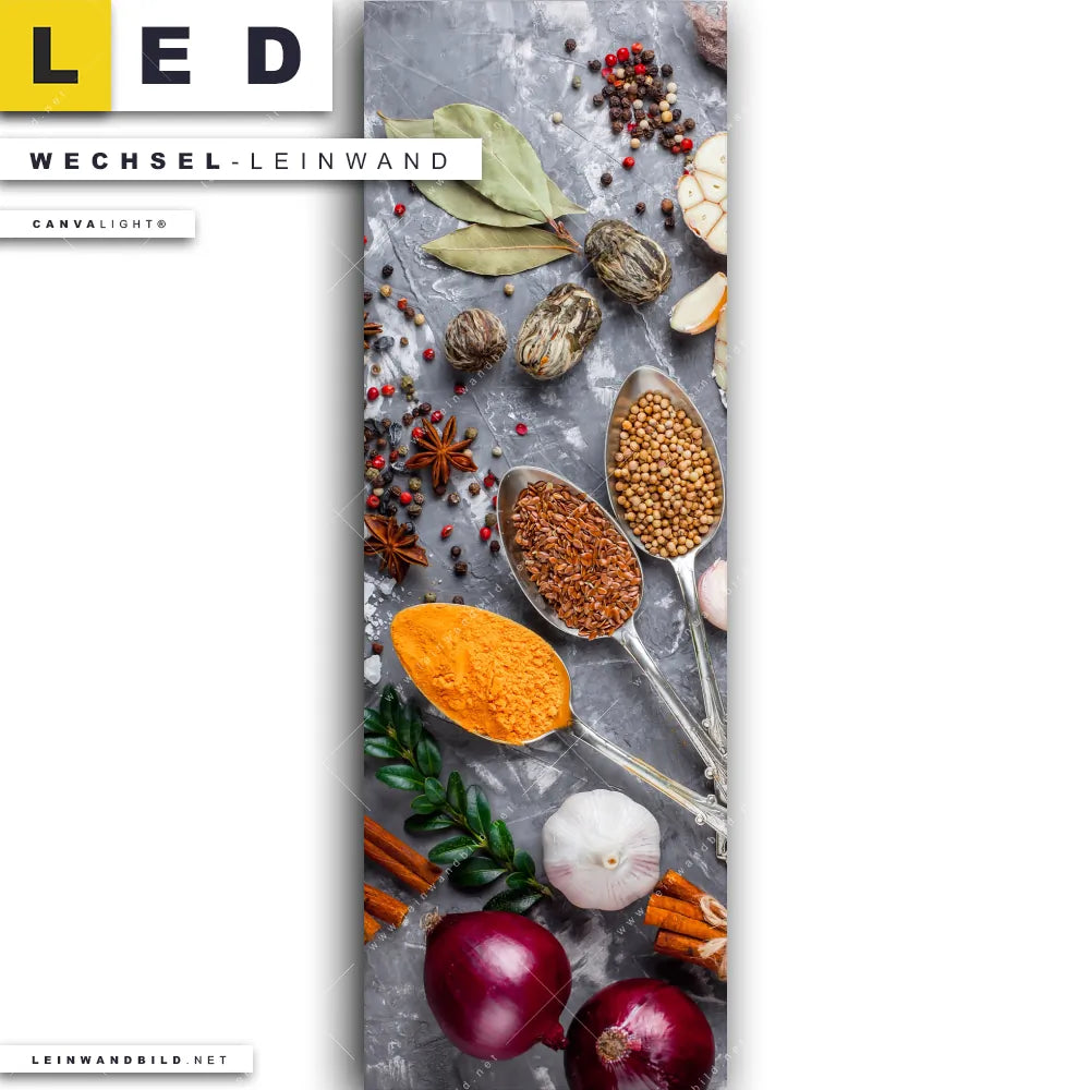Du bist auf der Suche nach einer Essen - Trinken Wechsel-Leinwand für Dein LED-Leinwandbild im Schmalen Format? Begriffe wie Gewürze, Kräuter, kochen, Pfeffer, Curry, Küche, Lebensmittel, gesund, Essen, Löffel, Besteck haben Dich auf der Suche nach Deiner Ersatz-Leinwand für dein LED Wandbild im Panorama-Hochformat mit wechselbarer Leinwand inspiriert? Farben wie Braun, Beige, Grün, Ocker, Hellgrün, Orange, Rot, Rosa, Blau, Gelb , Hellblau, Mint, Lila dürfen auf Deinem neuen Wechselmotiv für Dein XXL Leinwand-LED-Bild nicht fehlen und Leinwände im Modern Art, Natürlich - Realistisch Stil für Leuchtbilder passen perfekt zu Deinem Einrichtungsstil?