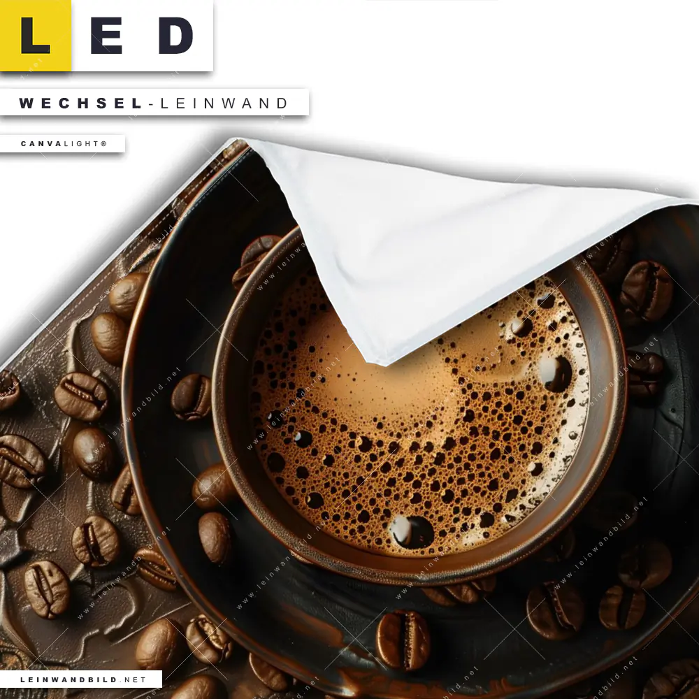 Bitte beachte, dass die Farben, der auf dem Monitor abgebildeten Kaffeekunst in Braun Darstellung, möglicherweise von den Originalfarben deiner Canvalight® TEX Wechsel-Leinwand abweichen können.
