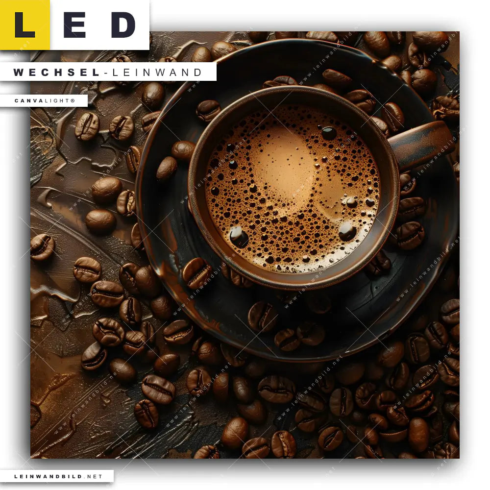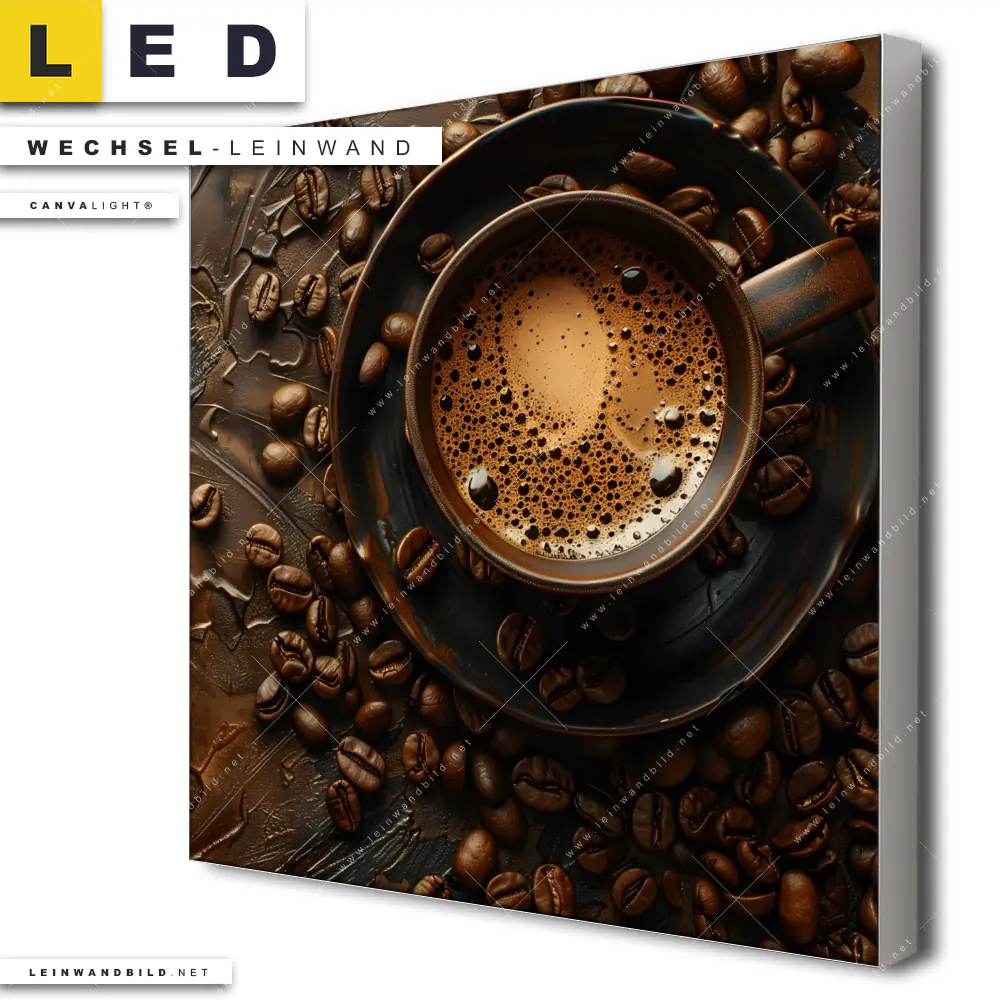 Du bist auf der Suche nach einer Essen - Trinken Wechsel-Leinwand für Dein LED-Leinwandbild im Quadratischen Format? Begriffe wie Kaffeebohnen, Kaffee, Kaffeegenuss, Trinken, Heißgetränk, Barista, Cafe, Espresso, Kaffeeliebhaber, Tasse haben Dich auf der Suche nach Deiner Ersatz-Leinwand für dein LED Wandbild mit wechselbarer Leinwand inspiriert? Farben wie Braun, Weiss, Beige dürfen auf Deinem neuen Wechselmotiv für Dein XXL Leinwand-LED-Bild nicht fehlen und Leinwände im Natürlich - Realistisch, Grunge Stil für Leuchtbilder passen perfekt zu Deinem Einrichtungsstil?