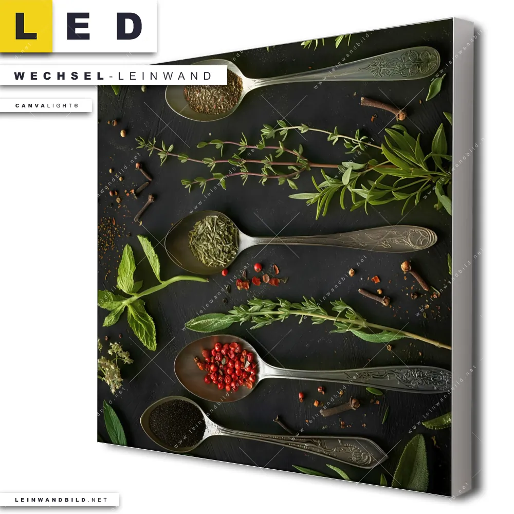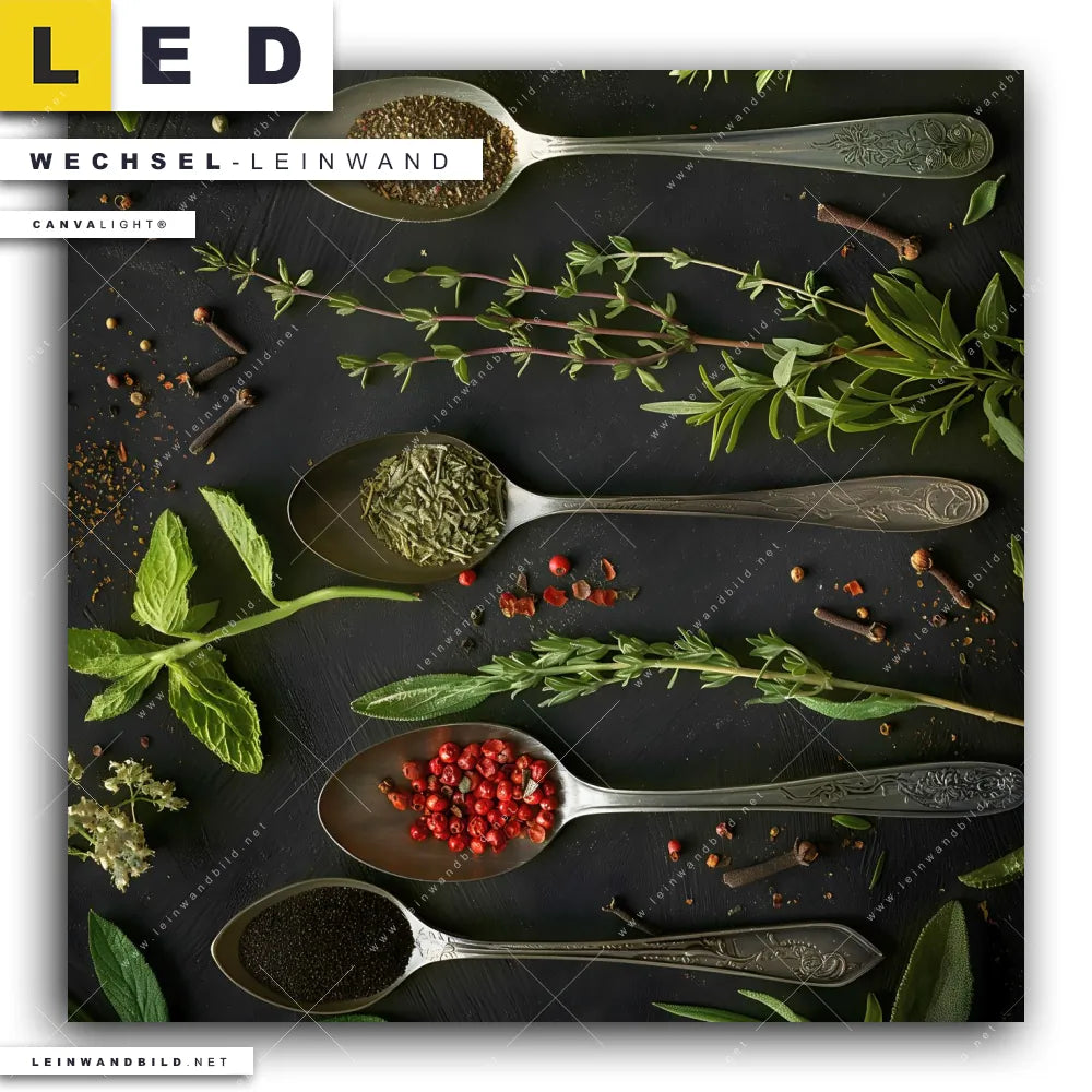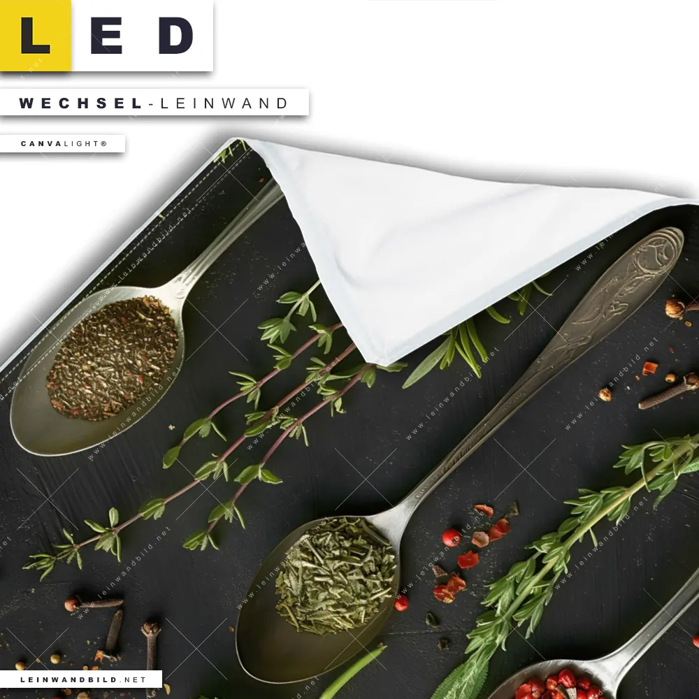 Du bist auf der Suche nach einer Essen - Trinken Wechsel-Leinwand für Dein LED-Leinwandbild im Quadratischen Format? Begriffe wie Löffel, Besteck, Kräuter, Gewürze, kochen, Zutaten, Lebensmittel, Geschmack, Aromen haben Dich auf der Suche nach Deiner Ersatz-Leinwand für dein LED Wandbild mit wechselbarer Leinwand inspiriert? Farben wie Silber, Schwarz, Grün dürfen auf Deinem neuen Wechselmotiv für Dein XXL Leinwand-LED-Bild nicht fehlen und Leinwände im Natürlich - Realistisch Stil für Leuchtbilder passen perfekt zu Deinem Einrichtungsstil?