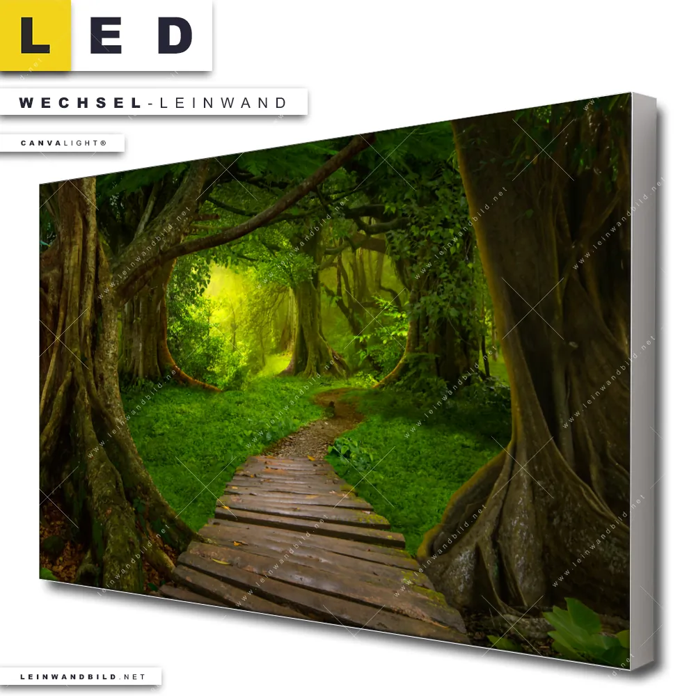 Bitte beachte, dass die Farben, der auf dem Monitor abgebildeten Holzweg durch tropische Wälder Darstellung, möglicherweise von den Originalfarben deiner Canvalight® TEX Wechsel-Leinwand abweichen können.
