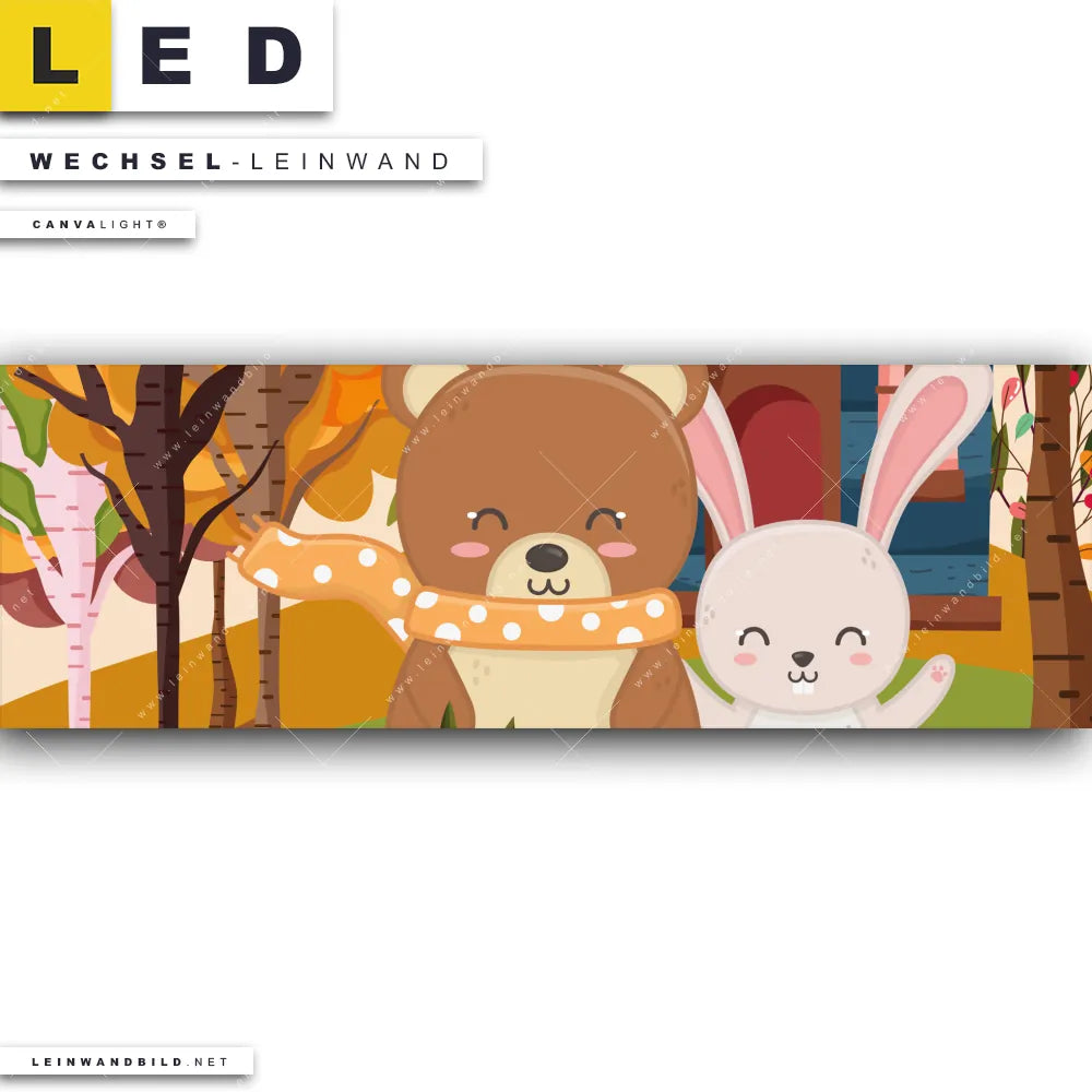 Dann sollte die Wechsel-Leinwand Canvalight® TEX | Bär & Häschen | Panorama den Weg zu Dir finden. Die Austausch-Leinwand Bär und Kaninchen freuen sich - passend für unsere stufenlos dimmbaren, steckerfertigen Leinwandbilder im LED Leuchtrahmen mit Fernbedienung und optionaler Farbtemperatursteuerung - fügt sich als Eye-Catcher harmonisch in jedes Kinderzimmer, Arzt - Praxis, Friseur - Beauty Raumkonzept ein.