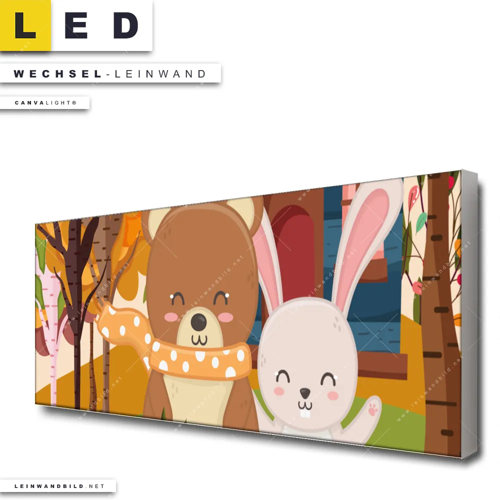 Du konfigurierst Deine individuelle LED Wechsel-Leinwand Canvalight® TEX | Bär & Häschen | Panorama und wir produzieren sie NEU für Dich. Unsere Tierwelt Austausch-Fotoleinwände für Canvalight® LED Bilder sind KEINE Lagerware. Du bist Dir unsicher, welches Motiv oder Format das richtige für dein individuelles LED Wechselmotiv auf Leinwand ist, dann helfen wir dir gerne weiter und beraten dich!