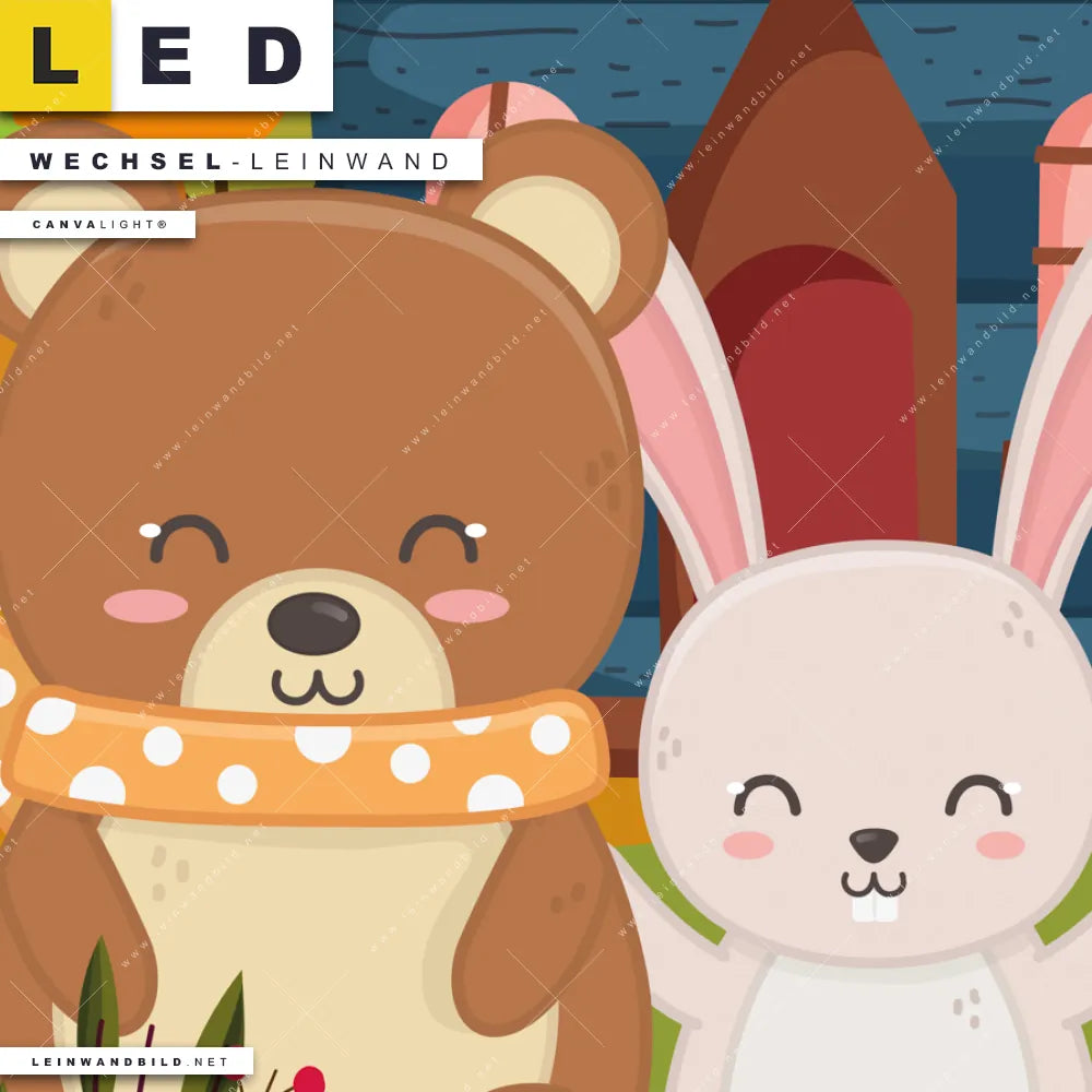 Bitte beachte, dass die Farben, der auf dem Monitor abgebildeten Kaninchen und Bär im Wald Darstellung, möglicherweise von den Originalfarben deiner Canvalight® TEX Wechsel-Leinwand abweichen können.