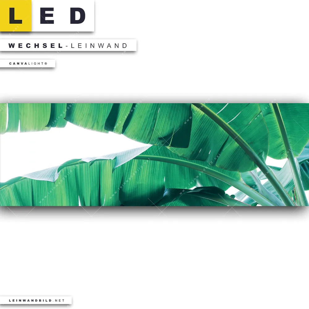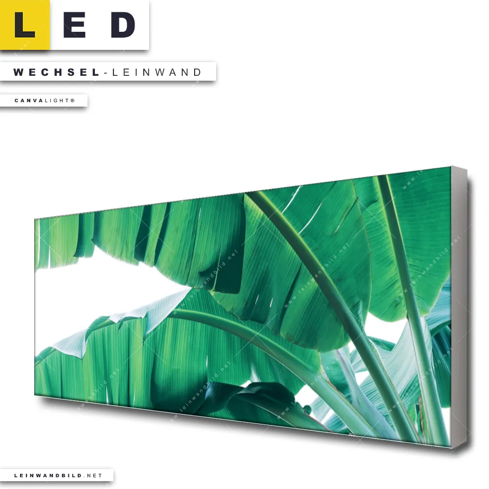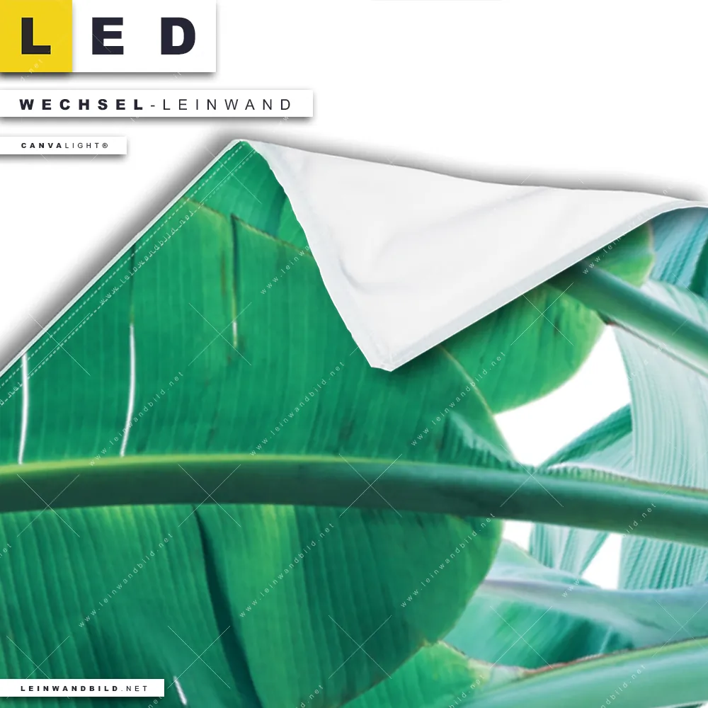 Du konfigurierst Deine individuelle LED Wechsel-Leinwand Canvalight® TEX | Bananenpalme | Panorama und wir produzieren sie NEU für Dich. Unsere Blumen - Botanik Austausch-Fotoleinwände für Canvalight® LED Bilder sind KEINE Lagerware. Du bist Dir unsicher, welches Motiv oder Format das richtige für dein individuelles LED Wechselmotiv auf Leinwand ist, dann helfen wir dir gerne weiter und beraten dich!