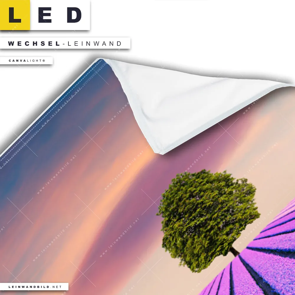 Bitte beachte, dass die Farben, der auf dem Monitor abgebildeten prächtiger Baum im Lavendelfeld Darstellung, möglicherweise von den Originalfarben deiner Canvalight® TEX Wechsel-Leinwand abweichen können.