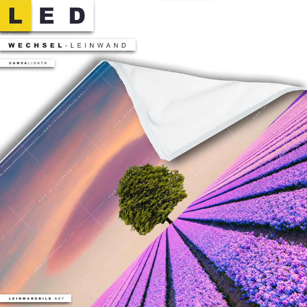 Bitte beachte, dass die Farben, der auf dem Monitor abgebildeten prächtiger Baum im Lavendelfeld Darstellung, möglicherweise von den Originalfarben deiner Canvalight® TEX Wechsel-Leinwand abweichen können.