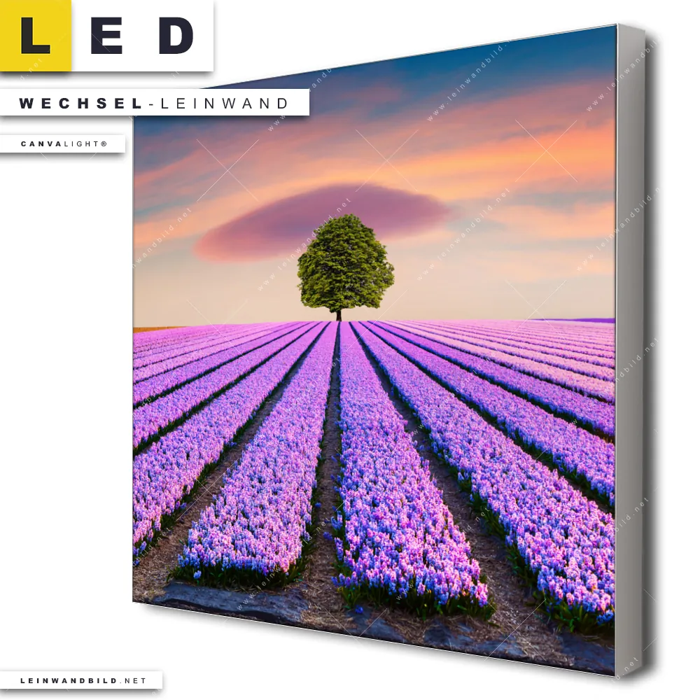Du bist auf der Suche nach einer Landschaften Wechsel-Leinwand für Dein LED-Leinwandbild im Quadratischen Format? Begriffe wie Blumen, Baum, Feld, Sonnenuntergang, Wiese, Himmel, Hyazinthenblumen, Hyazinthen haben Dich auf der Suche nach Deiner Ersatz-Leinwand für dein LED Wandbild mit wechselbarer Leinwand inspiriert? Farben wie Lila, Orange dürfen auf Deinem neuen Wechselmotiv für Dein XXL Leinwand-LED-Bild nicht fehlen und Leinwände im Floral, Natürlich - Realistisch Stil für Leuchtbilder passen perfekt zu Deinem Einrichtungsstil?