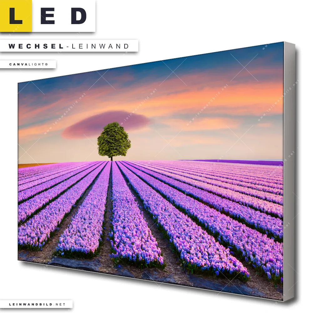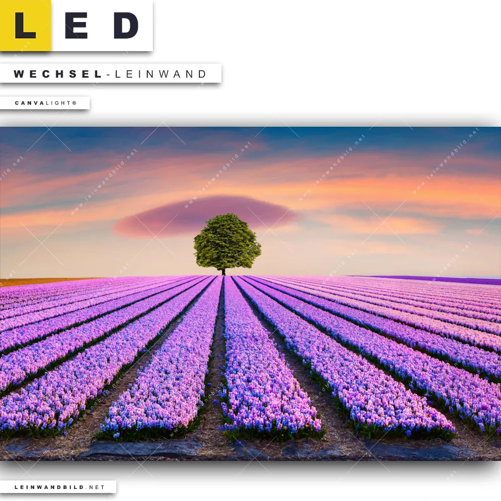 Du bist auf der Suche nach einer Landschaften Wechsel-Leinwand für Dein LED-Leinwandbild im Querformat? Begriffe wie Blumen, Baum, Feld, Sonnenuntergang, Wiese, Himmel, Hyazinthenblumen, Hyazinthen haben Dich auf der Suche nach Deiner Ersatz-Leinwand für dein breites LED Wandbild mit wechselbarer Leinwand inspiriert? Farben wie Lila, Orange dürfen auf Deinem neuen Wechselmotiv für Dein XXL Leinwand-LED-Bild nicht fehlen und Leinwände im Floral, Natürlich - Realistisch Stil für Leuchtbilder passen perfekt zu Deinem Einrichtungsstil?