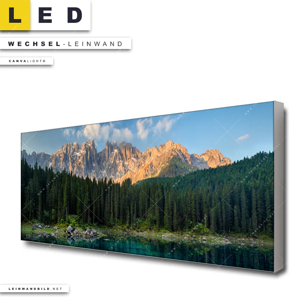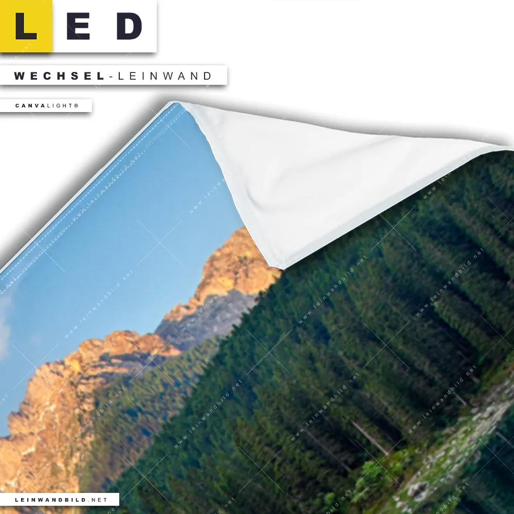 Du konfigurierst Deine individuelle LED Wechsel-Leinwand Canvalight® TEX | Bergsee im Wald | Panorama und wir produzieren sie NEU für Dich. Unsere Landschaften Austausch-Fotoleinwände für Canvalight® LED Bilder sind KEINE Lagerware. Du bist Dir unsicher, welches Motiv oder Format das richtige für dein individuelles LED Wechselmotiv auf Leinwand ist, dann helfen wir dir gerne weiter und beraten dich!
