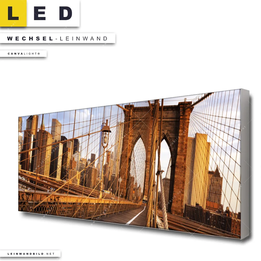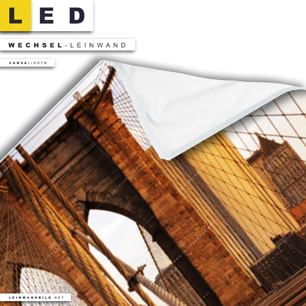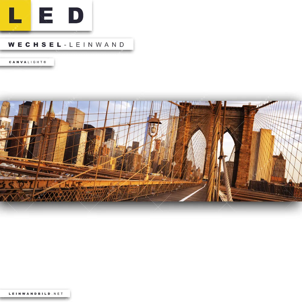 Du konfigurierst Deine individuelle LED Wechsel-Leinwand Canvalight® TEX | Berühmte Brooklyn Bridge | Panorama und wir produzieren sie NEU für Dich. Unsere Architektur - Gebäude, Städte - Skylines Austausch-Fotoleinwände für Canvalight® LED Bilder sind KEINE Lagerware. Du bist Dir unsicher, welches Motiv oder Format das richtige für dein individuelles LED Wechselmotiv auf Leinwand ist, dann helfen wir dir gerne weiter und beraten dich!