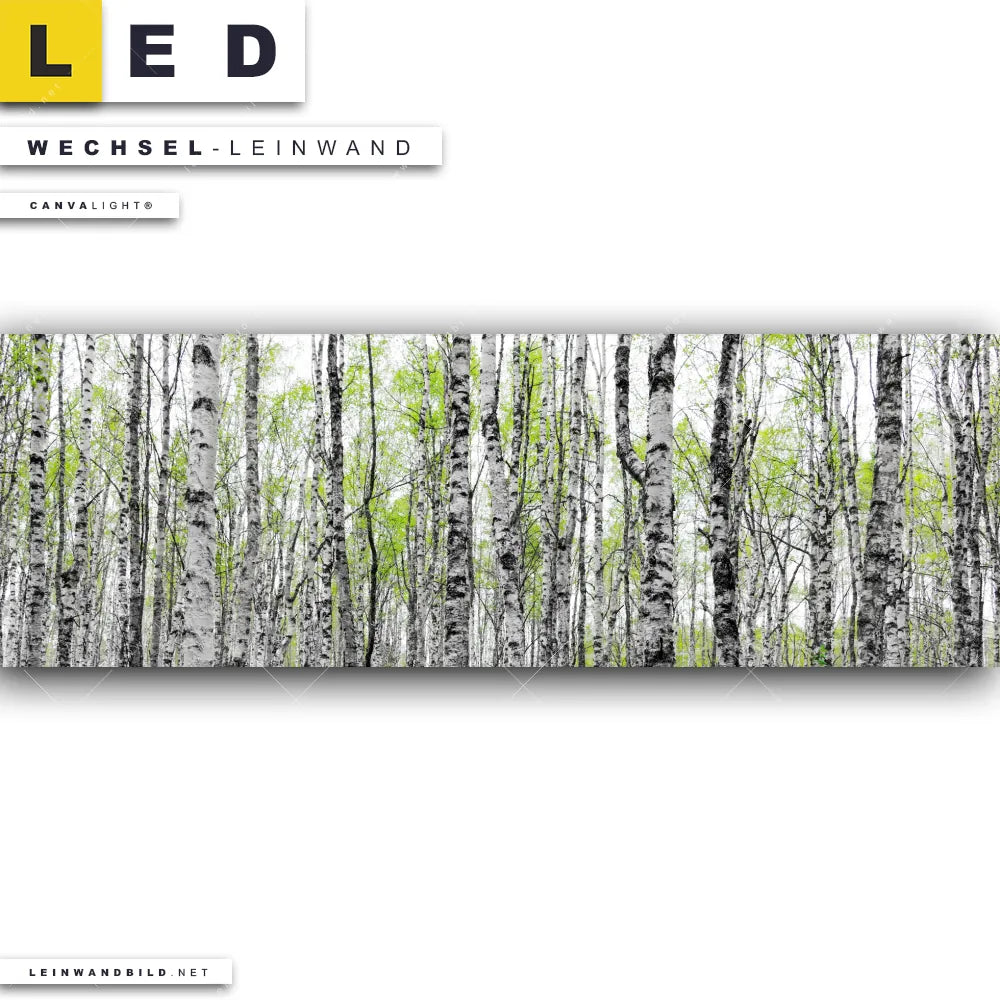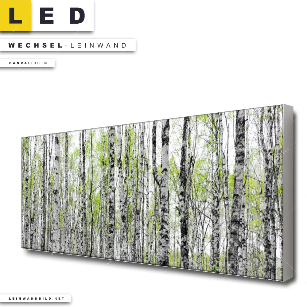 Du bist auf der Suche nach einer Landschaften, Wald - Bäume Wechsel-Leinwand für Dein LED-Leinwandbild im Panorama-Format? Begriffe wie Wald, Landschaft, Bäume, Natur, Birken, Ruhe, Stille haben Dich auf der Suche nach Deiner Ersatz-Leinwand für dein extra breites LED Wandbild mit wechselbarer Leinwand inspiriert? Farben wie Grün, Weiss dürfen auf Deinem neuen Wechselmotiv für Dein XXL Leinwand-LED-Bild nicht fehlen und Leinwände im Natürlich - Realistisch, Modern Art Stil für Leuchtbilder passen perfekt zu Deinem Einrichtungsstil?