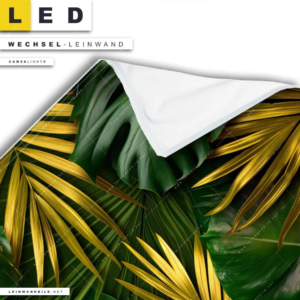 Dann sollte die Wechsel-Leinwand Canvalight® TEX | Blätter Gold Grün | Querformat den Weg zu Dir finden. Die Austausch-Leinwand Tropische Blätter in Gold - passend für unsere stufenlos dimmbaren, steckerfertigen Leinwandbilder im Leuchtrahmen mit Fernbedienung und optionaler Farbtemperatursteuerung - fügt sich als Eye-Catcher harmonisch in jedes Wohnzimmer - Schlafzimmer, Arzt - Praxis, Büro - Kanzlei, Flur - Eingangsbereich Raumkonzept ein.