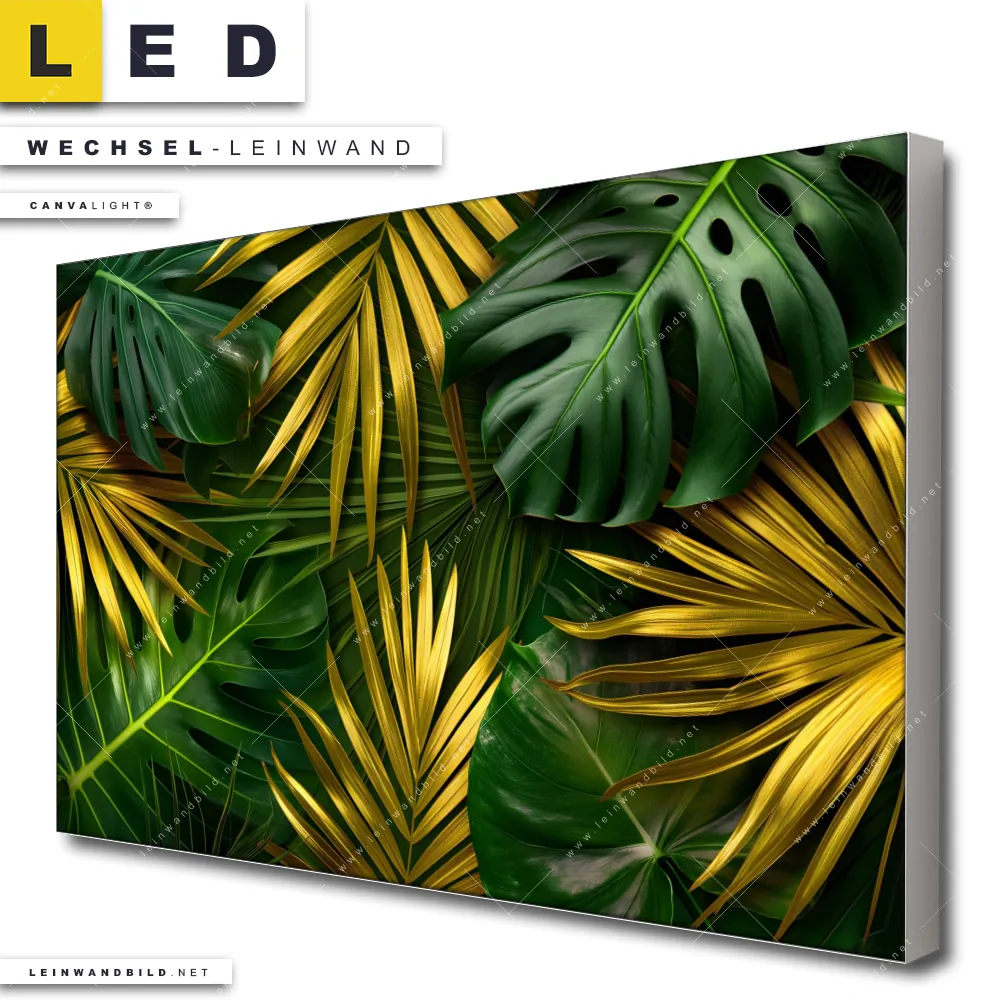 Du bist auf der Suche nach einer Blumen - Botanik, Muster - Texturen Wechsel-Leinwand für Dein LED-Leinwandbild im Querformat? Begriffe wie Monstera, Palmenblätter, Blätter, Pflanze, Natur, Nahaufnahme, Laub, Dschungel haben Dich auf der Suche nach Deiner Ersatz-Leinwand für dein breites LED Wandbild mit wechselbarer Leinwand inspiriert? Farben wie Gold, Grün dürfen auf Deinem neuen Wechselmotiv für Dein XXL Leinwand-LED-Bild nicht fehlen und Leinwände im Floral, Modern Art Stil für Leuchtbilder passen perfekt zu Deinem Einrichtungsstil?