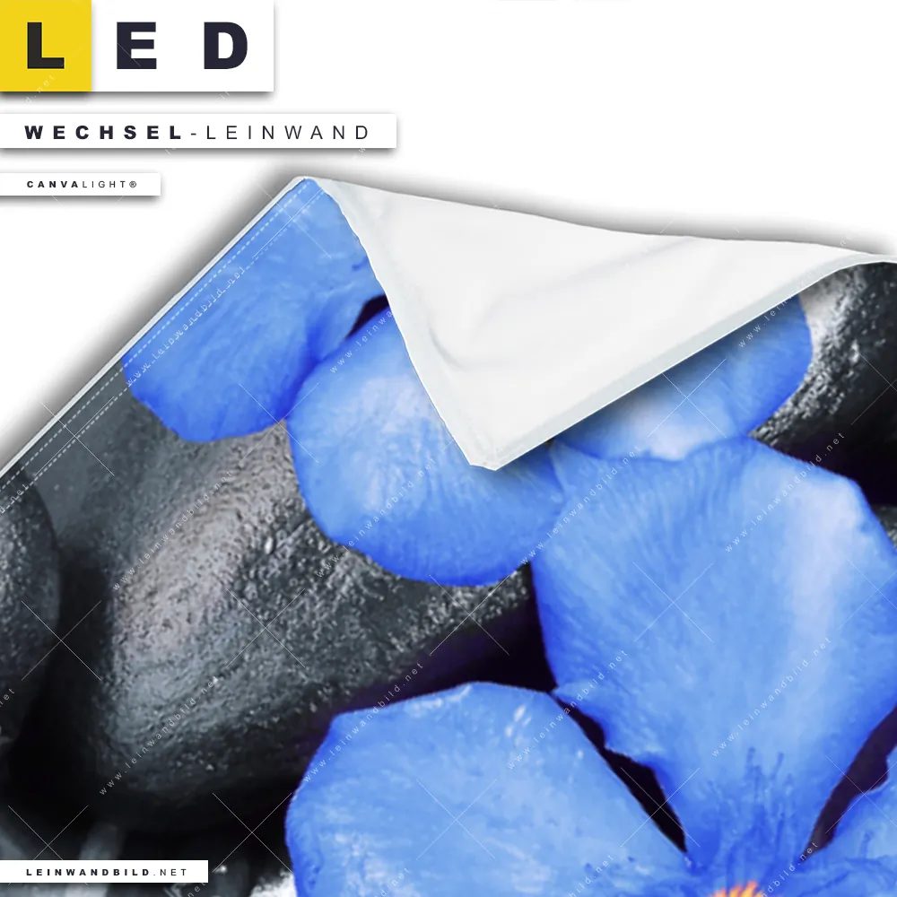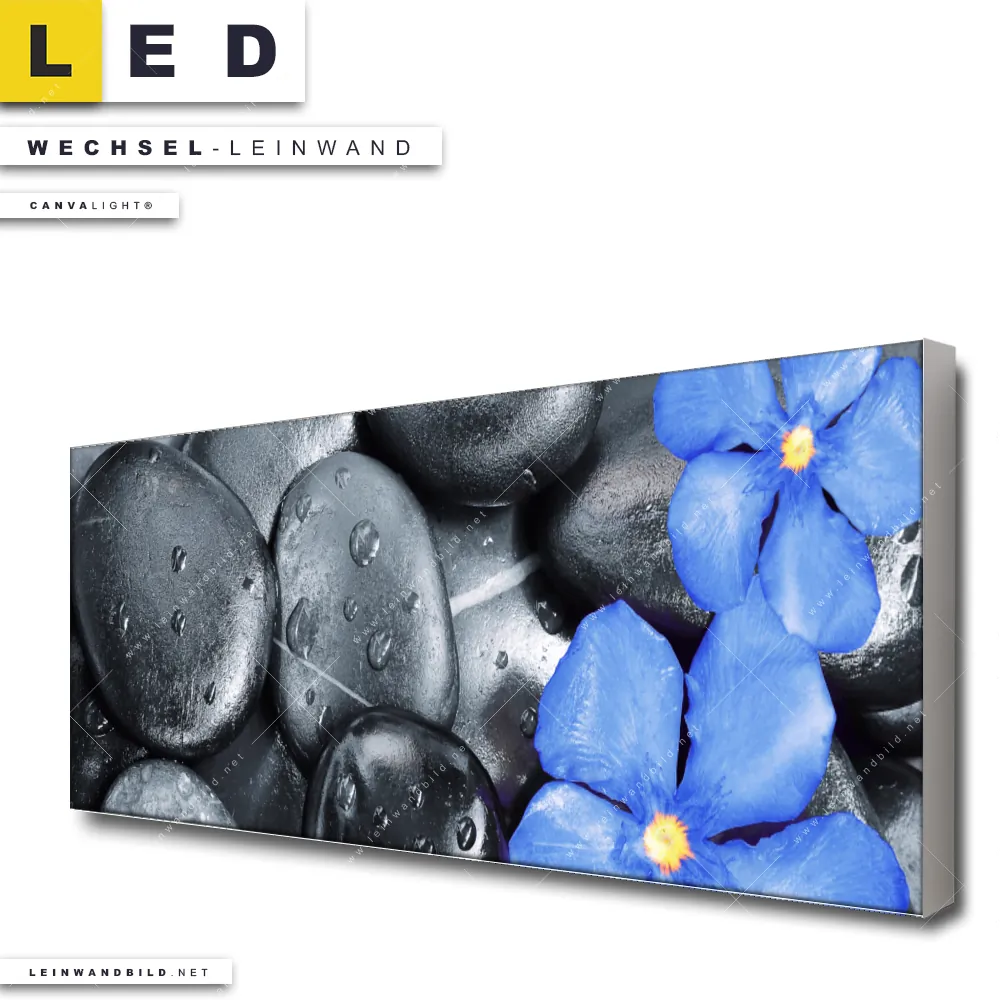 LED Wechsel-Leinwand Canvalight® TEX | Blaue Blume & Graue Steine | Panorama