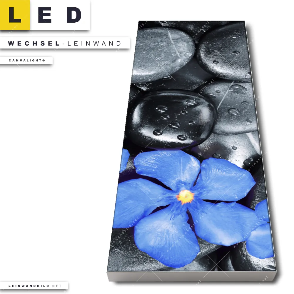 Du konfigurierst Deine individuelle LED Wechsel-Leinwand Canvalight® TEX | Blaue Blume & Graue Steine | Schmal und wir produzieren sie NEU für Dich. Unsere Buddha - Feng Shui, Blumen - Botanik Austausch-Fotoleinwände für Canvalight® LED Bilder sind KEINE Lagerware. Du bist Dir unsicher, welches Motiv oder Format das richtige für dein individuelles LED Wechselmotiv auf Leinwand ist, dann helfen wir dir gerne weiter und beraten dich!