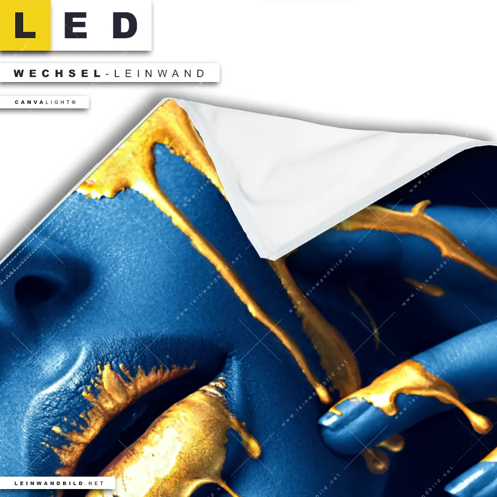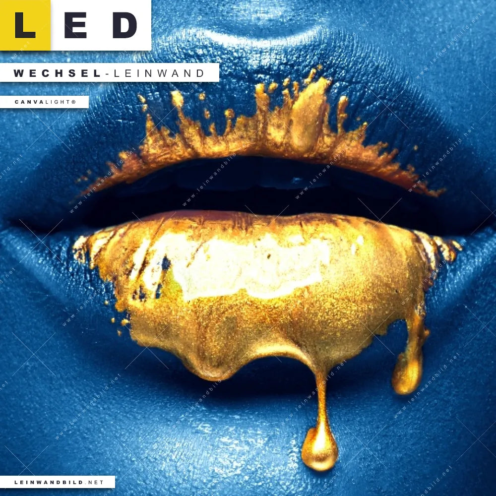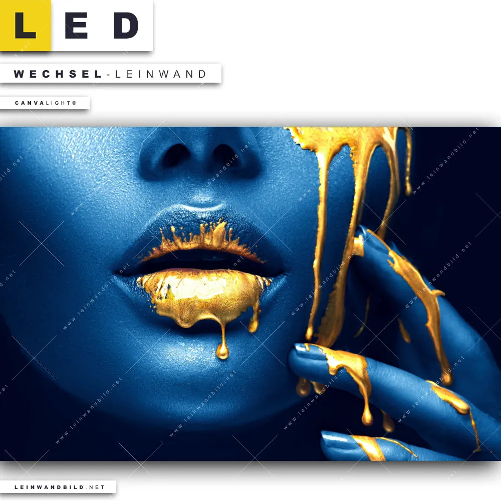 Du bist auf der Suche nach einer Porträts - Menschen Wechsel-Leinwand für Dein LED-Leinwandbild im Querformat? Begriffe wie Frau, Lippen, Mund, Farbe, Beauty haben Dich auf der Suche nach Deiner Ersatz-Leinwand für dein breites LED Wandbild mit wechselbarer Leinwand inspiriert? Farben wie Gold, Blau dürfen auf Deinem neuen Wechselmotiv für Dein XXL Leinwand-LED-Bild nicht fehlen und Leinwände im Modern Art Stil für Leuchtbilder passen perfekt zu Deinem Einrichtungsstil?