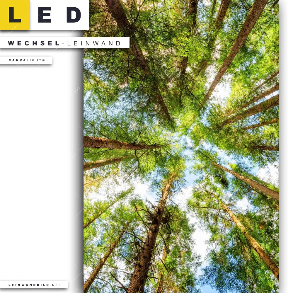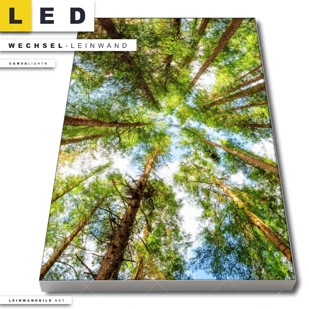 Du bist auf der Suche nach einer Landschaften, Wald - Bäume Wechsel-Leinwand für Dein LED-Leinwandbild im Hochformat? Begriffe wie Wald, Landschaft, Baum, Bäume, Natur, Baumkrone, Froschperspektive haben Dich auf der Suche nach Deiner Ersatz-Leinwand für dein LED Wandbild mit wechselbarer Leinwand inspiriert? Farben wie Grün, Hellgrün, Hellblau dürfen auf Deinem neuen Wechselmotiv für Dein XXL Leinwand-LED-Bild nicht fehlen und Leinwände im Natürlich - Realistisch Stil für Leuchtbilder passen perfekt zu Deinem Einrichtungsstil?