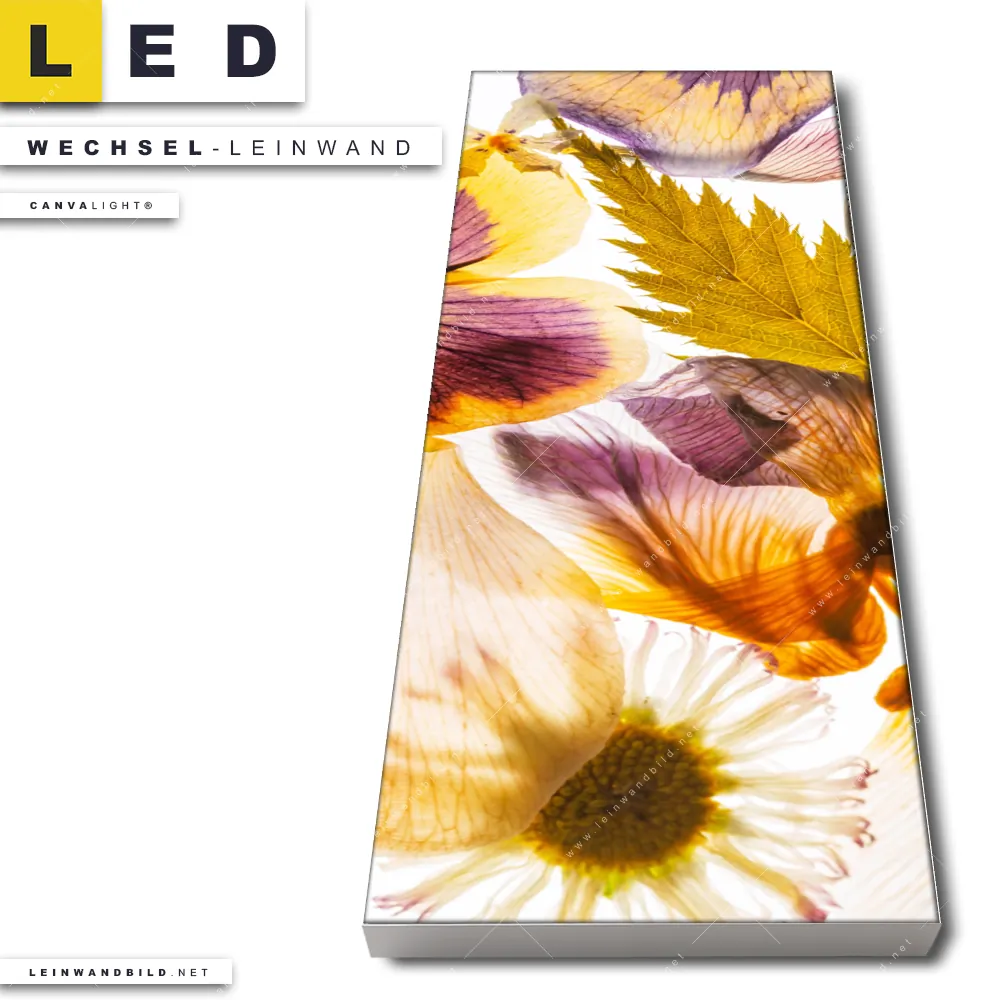 Du konfigurierst Deine individuelle LED Wechsel-Leinwand Canvalight® TEX | Blumen Collage No.1 | Schmal und wir produzieren sie NEU für Dich. Unsere Blumen - Botanik Austausch-Fotoleinwände für Canvalight® LED Bilder sind KEINE Lagerware. Du bist Dir unsicher, welches Motiv oder Format das richtige für dein individuelles LED Wechselmotiv auf Leinwand ist, dann helfen wir dir gerne weiter und beraten dich!