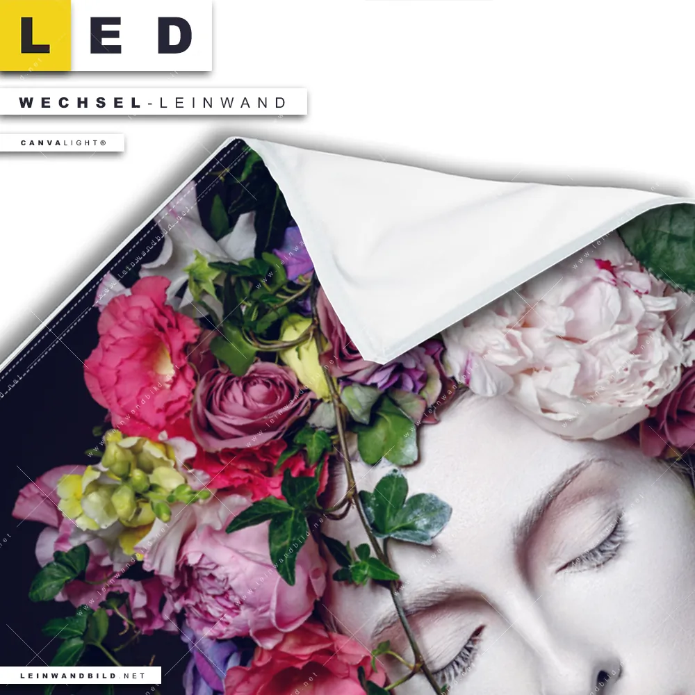 Dann sollte die Wechsel-Leinwand Canvalight® TEX | Blumen-Königin | Hochformat den Weg zu Dir finden. Die Austausch-Leinwand Frauenporträt mit Blumen - passend für unsere stufenlos dimmbaren, steckerfertigen Leinwandbilder im Leuchtrahmen mit Fernbedienung und optionaler Farbtemperatursteuerung - fügt sich als Eye-Catcher harmonisch in jedes Bar - Gastronomie, Friseur - Beauty, Wohnzimmer - Schlafzimmer Raumkonzept ein.
