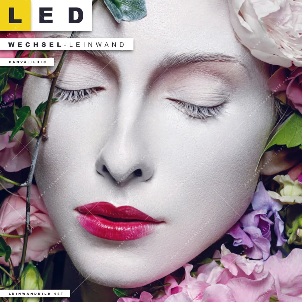Du bist auf der Suche nach einer Porträts - Menschen, Blumen - Botanik Wechsel-Leinwand für Dein LED-Leinwandbild im Hochformat? Begriffe wie Menschen & Blumen, Frau, Porträt, modern, Beauty, Gesicht, Blumen, Blüten, Schönheit, Mode haben Dich auf der Suche nach Deiner Ersatz-Leinwand für dein LED Wandbild mit wechselbarer Leinwand inspiriert? Farben wie Schwarz, Weiss, Grün, Rosa, Rot, Lila dürfen auf Deinem neuen Wechselmotiv für Dein XXL Leinwand-LED-Bild nicht fehlen und Leinwände im Modern Art, Floral Stil für Leuchtbilder passen perfekt zu Deinem Einrichtungsstil?