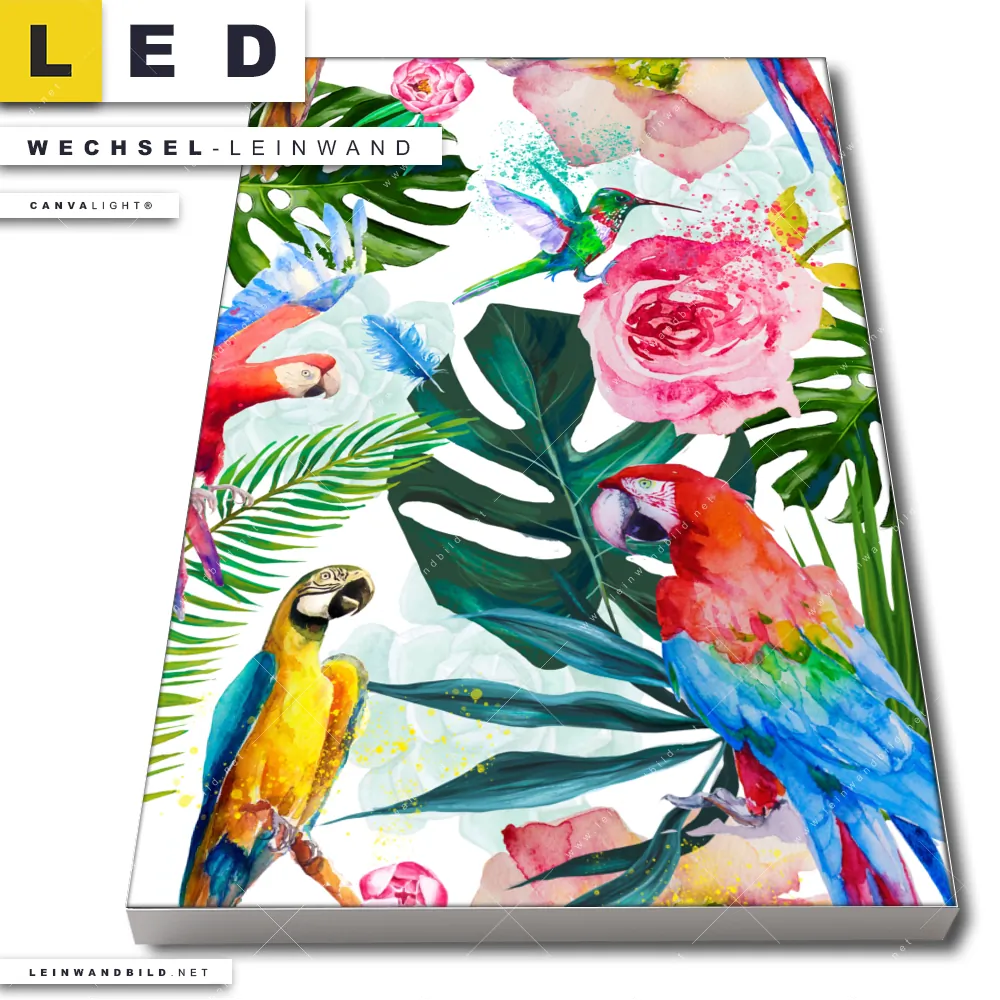 LED Wechsel-Leinwand Canvalight® TEX | Blumen & Papageien Aquarell | Hochformat
