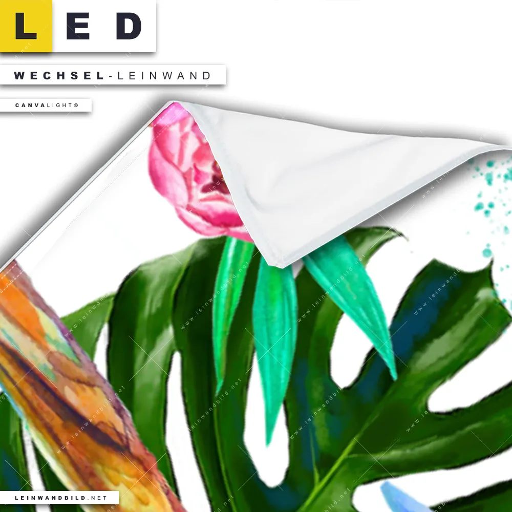 Bitte beachte, dass die Farben, der auf dem Monitor abgebildeten Vogel- und Pflanzenparadies Darstellung, möglicherweise von den Originalfarben deiner Canvalight® TEX Wechsel-Leinwand abweichen können.