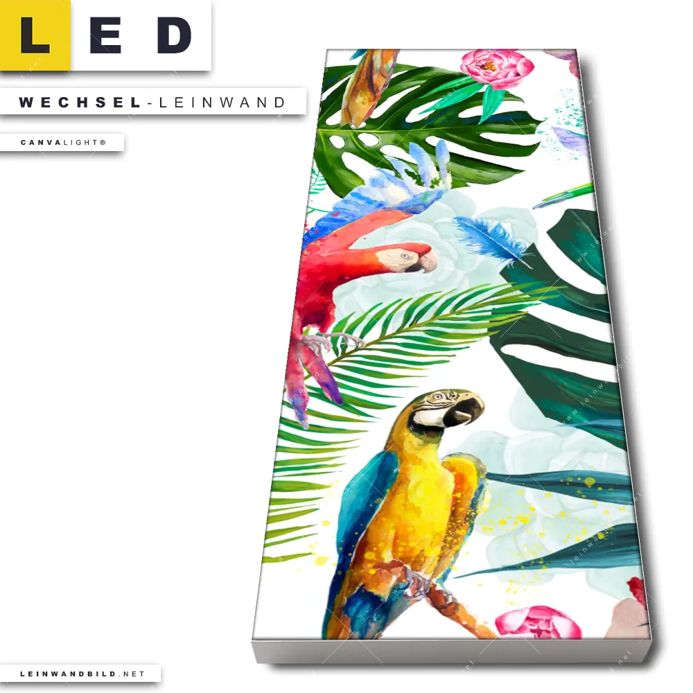 Dann sollte die Wechsel-Leinwand Canvalight® TEX | Blumen & Papageien Aquarell | Schmal den Weg zu Dir finden. Die Austausch-Leinwand bunte Tropenvielfalt - passend für unsere stufenlos dimmbaren, steckerfertigen Leinwandbilder im LED Leuchtrahmen mit Fernbedienung und optionaler Farbtemperatursteuerung - fügt sich als Eye-Catcher harmonisch in jedes Wohnzimmer - Schlafzimmer, Flur - Eingangsbereich, Küche - Esszimmer, Arzt - Praxis, Friseur - Beauty Raumkonzept ein.