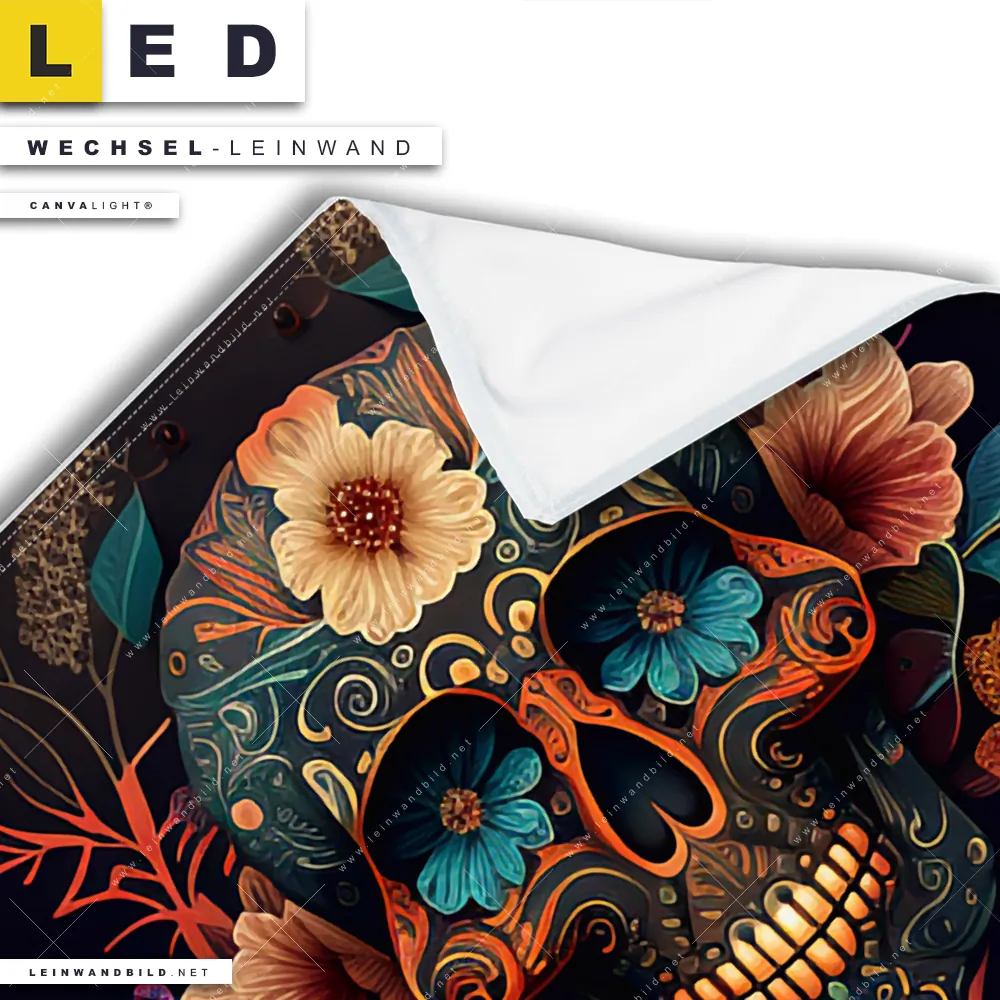 Auf der Suche nach Deinem neuen Wechselmotiv für LED Bilder mit austauschbarer Textil-Leinwand haben Dich Begriffe wie Schädel, Totenkopf, Skelett, Skull, Knochen, Blumen, Blüten, Blätter inspiriert? Dann sollte die Wechsel-Leinwand Totenkopf mit Blumen für Canvalight® TEX LED Leuchtbilder den Weg zu Dir finden.