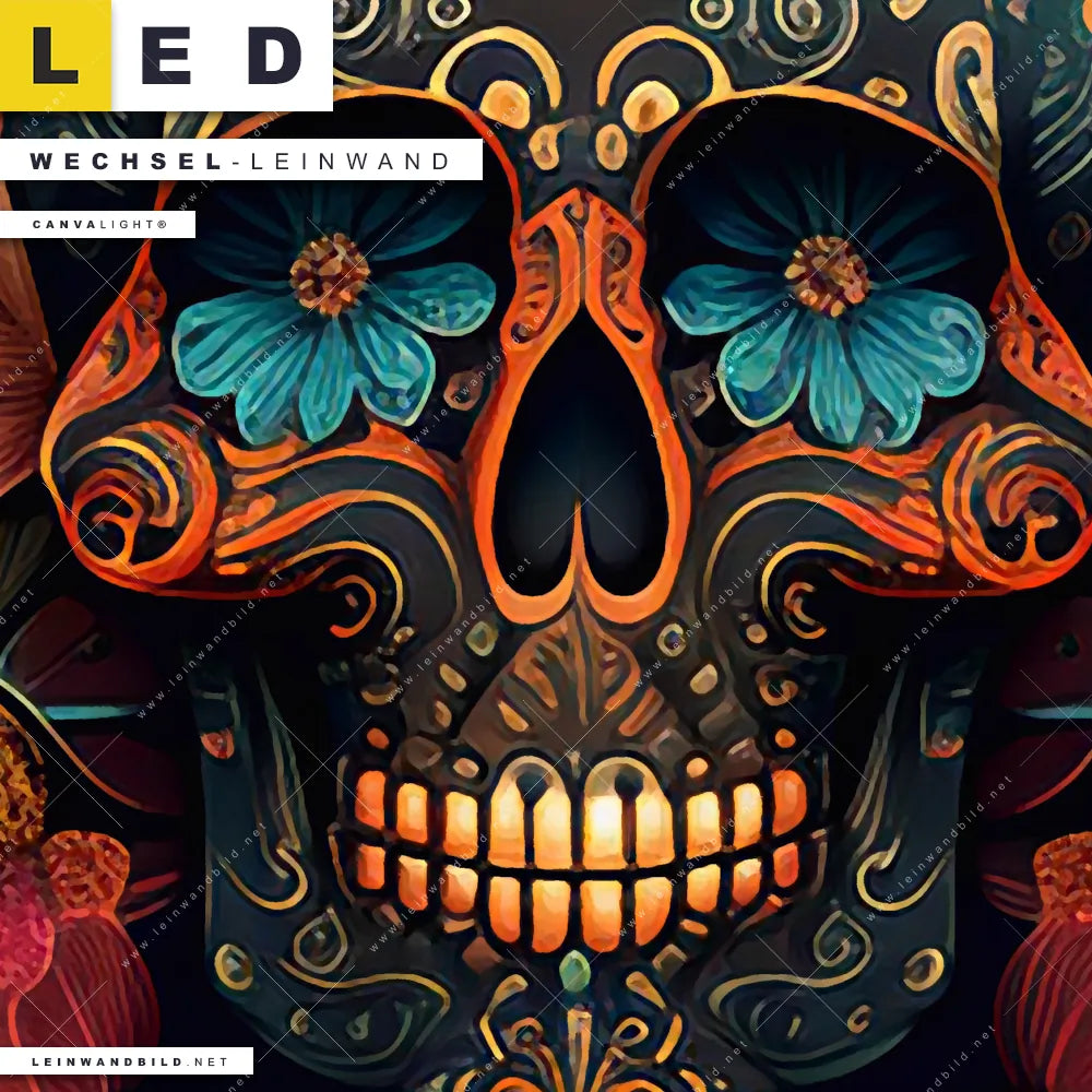 Du bist auf der Suche nach einer Porträts - Menschen, Blumen - Botanik Wechsel-Leinwand für Dein LED-Leinwandbild im Quadratischen Format? Begriffe wie Schädel, Totenkopf, Skelett, Skull, Knochen, Blumen, Blüten, Blätter haben Dich auf der Suche nach Deiner Ersatz-Leinwand für dein LED Wandbild mit wechselbarer Leinwand inspiriert? Farben wie Gold, Schwarz, Rot, Türkis, Bunt, Orange dürfen auf Deinem neuen Wechselmotiv für Dein XXL Leinwand-LED-Bild nicht fehlen und Leinwände im Modern Art, Floral Stil für Leuchtbilder passen perfekt zu Deinem Einrichtungsstil?