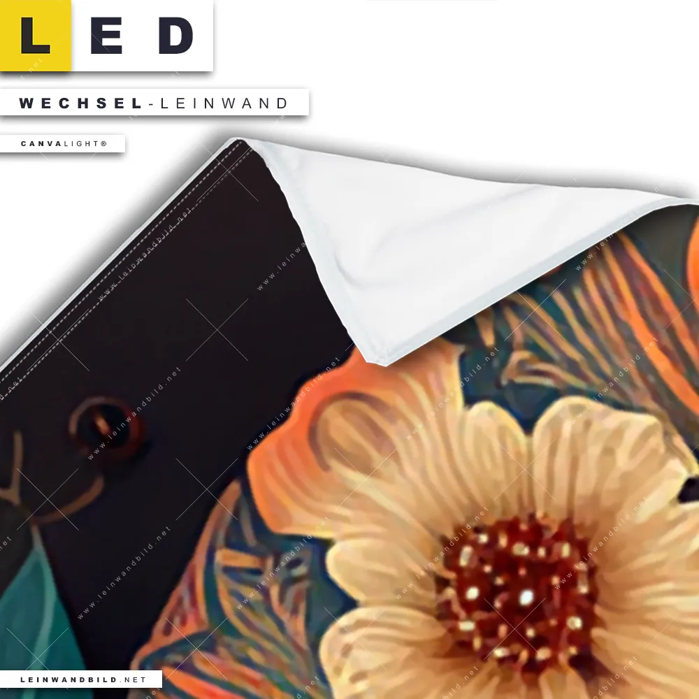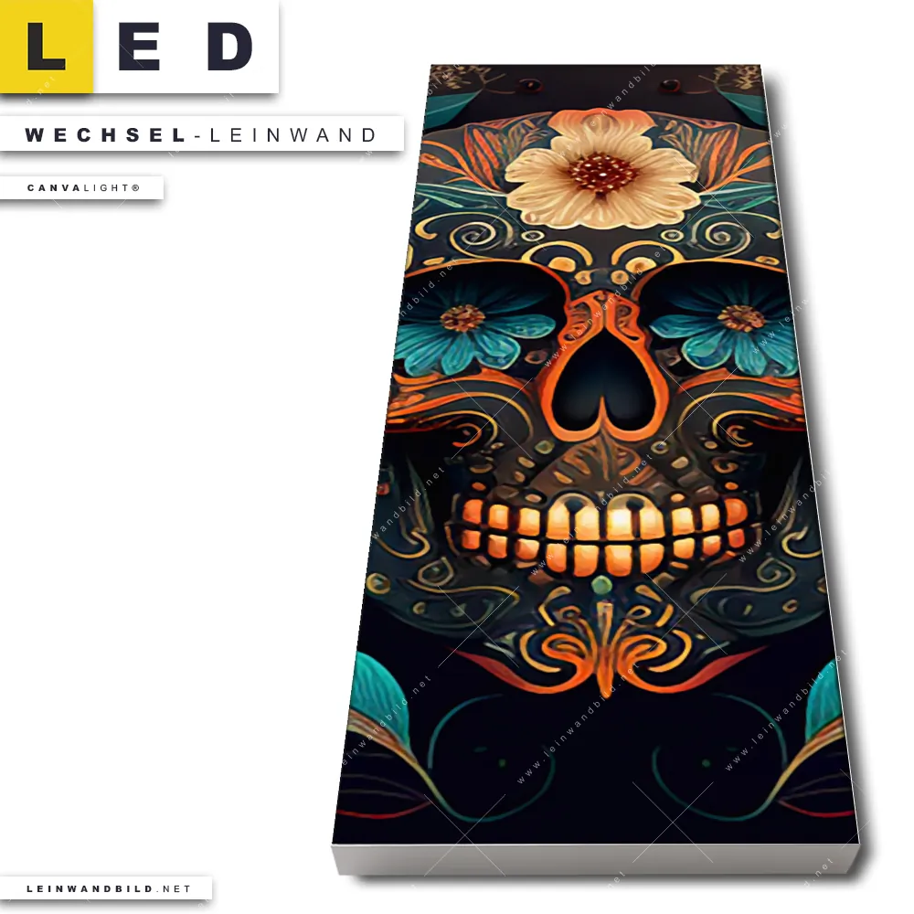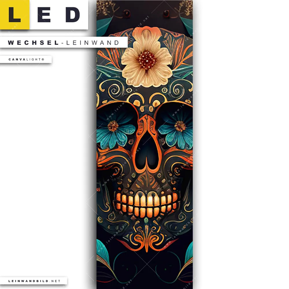 LED Wechsel-Leinwand Canvalight® TEX | Blumenschädel schwarz | Schmal